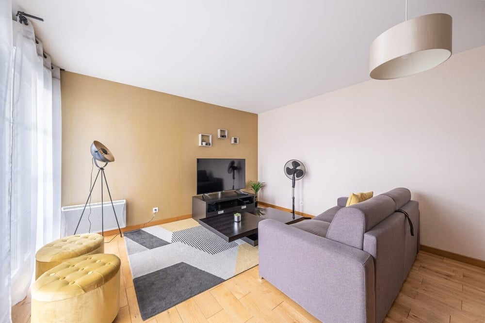 Très bien situé, le logement comprend : _ Un salon séjour avec canapé convertible couchage 2 Personnes, télévision, table basse, Grande Table à Manger pour 6 personnes _Cuisine ouverte toute équipée ( Four, Micro onde, Grille Pain, Cafetière, Bouilloire, ) _ Deux grandes chambres avec Dressing _Salle de bain avec baignoire (Wc séparé) _Internet très haut débit (fibre) , Netflix, TV d'Orange. _ Machine à laver _ Serviettes et Draps de lits fournis