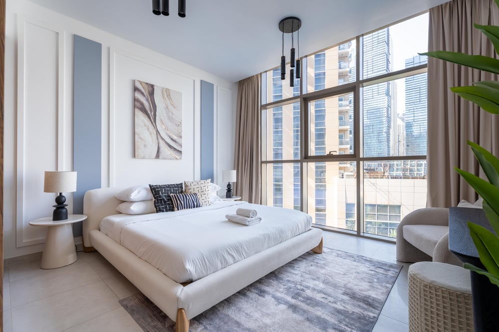 Welcome to my apartment! Modern and designed with an open-floor living, dining, and kitchen area, this home is a peaceful place to retreat after a long day in the city. In the bright living room, you will find a comfortable sitting area with an armchair, a TV with a Netflix subscription and large windows that bathe the entire space in natural sunlight throughout the day. The kitchen is fully equipped with essential cookware and cutlery, such as a stove, an oven, and a microwave, to prepare a delicious meal. There are two beautiful bedrooms, with a king-size bed and an ensuite bathroom each. A service bathroom in the hallway that has fresh towels, a hairdryer, and complimentary toiletries to make your stay even more comfortable. The property has been professionally cleaned and strategically sanitised for your health and safety. Daily housekeeping services are available upon request for an additional fee. The apartment also opens onto a little terrace, providing the perfect spot to savour the soft breeze and a cup of coffee. Enjoy your stay! Please note, Dubai is a vibrant and ever-growing city, and with these developments come occasional construction in the apartment building or surrounding area. While this may bring some urban sounds or affect the views from the property, it is all part of the city’s dynamic growth. We truly appreciate your understanding and look forward to hosting you.