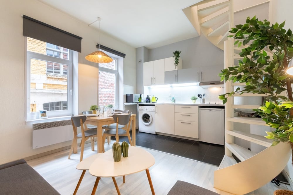 This flat is located in a quiet, family-friendly building, so it is suitable for responsible, respectful travellers; please be sure not to party or make any excessive noise (music, shouting) after 9pm. You will appreciate this apartment configured on two levels, a pretty duplex fully equipped for your stay: 1st level: - Living room with open-plan fitted kitchen 2nd level: - Attic bedroom with double bed - A bathroom with bath and WC its bathroom You'll love its facilities and location! The staircase in the accommodation is spiral (see photo), so we recommend that families with young children or people with mobility difficulties take this into consideration before booking. The accommodation will be carefully prepared for your arrival: Professional cleaning service + laundry for household linen. All linen is provided: bed linen, bath towels, bath mats and tea towels. The kitchen is equipped with all utensils and dishes for breakfast and dinner. Entertainment available via TV: Molotov TV and Prime Video.