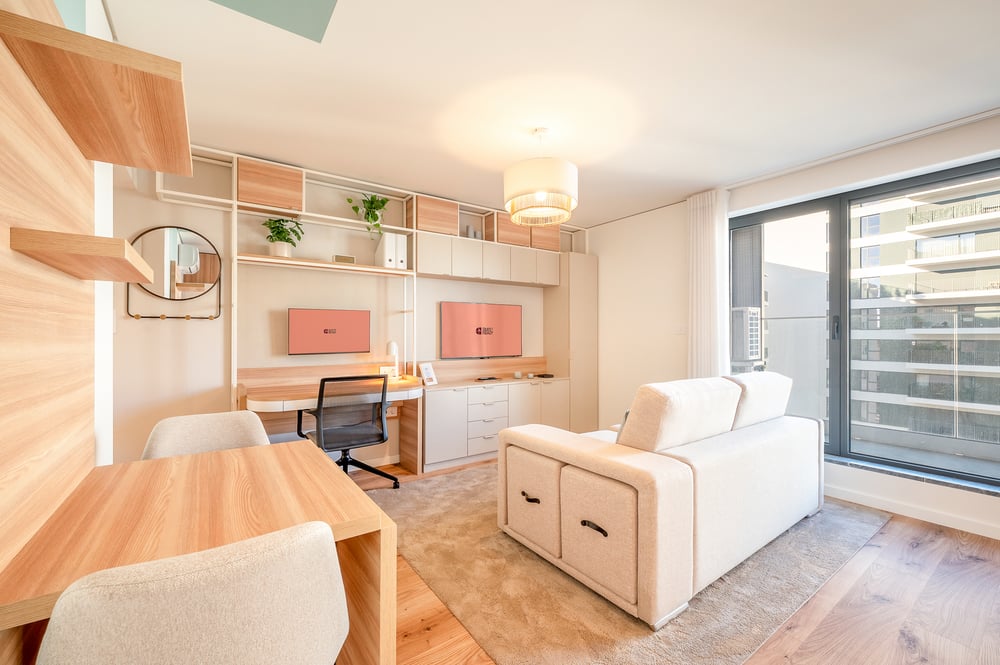 Welcome! This modern 39 m² apartment, elegantly decorated and part of an exceptional project, will provide you with a stay full of comfort, tranquillity, and convenience. The open-concept design harmoniously combines the living, dining, and kitchen areas. The living area features a double sofa bed, a TV, and a desk equipped with a screen for catching up on tasks. From the living area, you also have direct access to the balcony, where you can enjoy the view of the neighbourhood. In the bedroom, you will find a comfortable double bed that provides a restful night's sleep, along with a wardrobe to store your belongings. The kitchen is fully equipped with essential cookware, including an electric hob, coffee machine, washing machine, and dishwasher, along with all the necessary equipment to prepare every meal of the day. The space features an extendable dining table for sharing meals. The entire space is illuminated by natural light during the day, creating a bright and welcoming atmosphere. The bathroom is carefully stocked with fresh towels and complimentary toiletries for your convenience. Professionally cleaned for your comfort, the apartment is located on the 6th floor of the building, accessible by elevator. Guests have complimentary access to the onsite Maleo Spot, an elegant and tranquil business lounge for coworking, as well as exclusive benefits at all of Maleo’s Office Centres in Lisbon. Enjoy your stay!