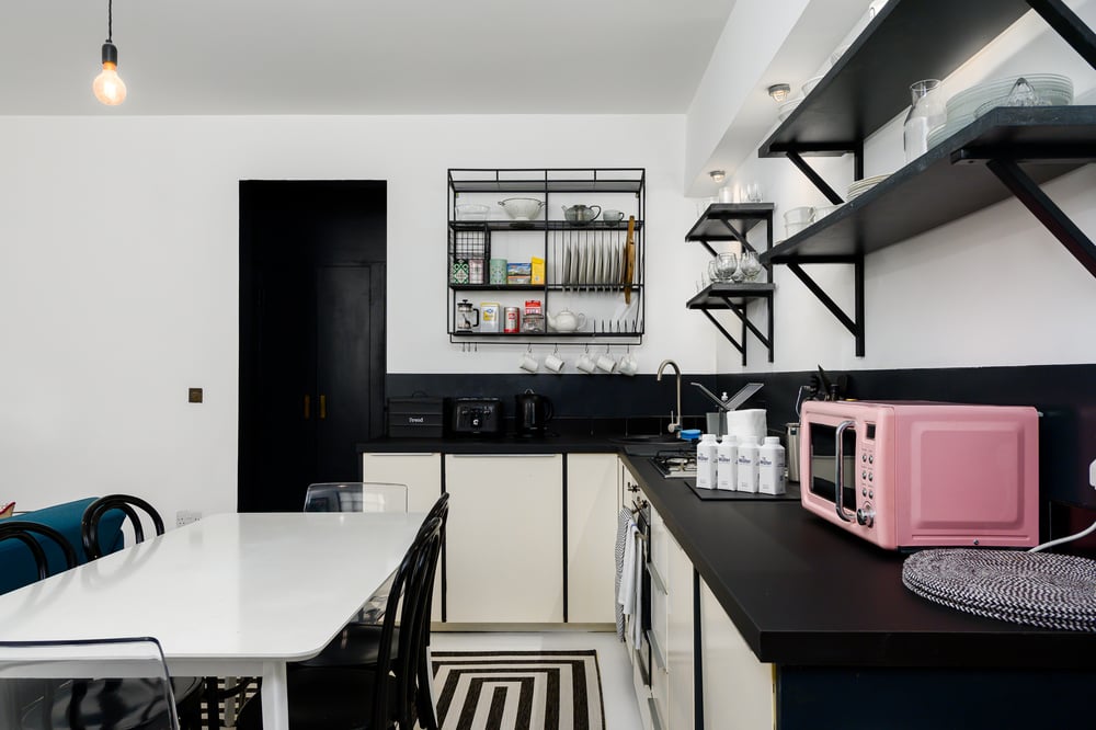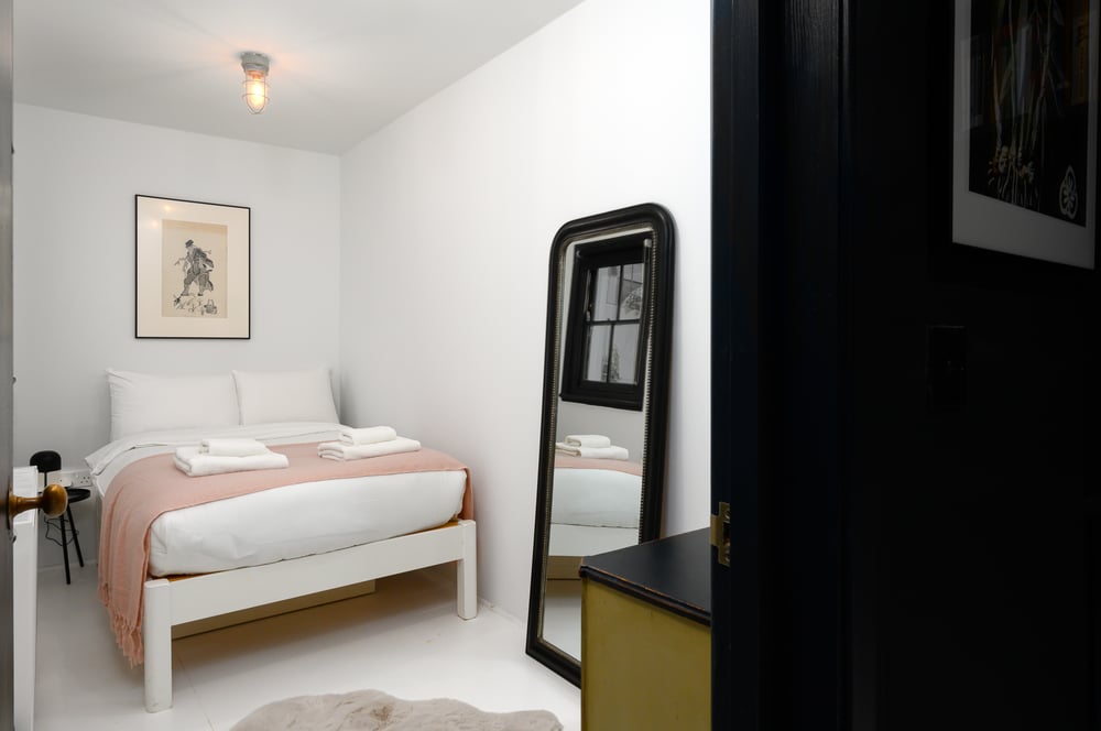 Welcome to a modern urban retreat located on the lower ground floor, where the open-plan kitchen seamlessly connects to a cozy living area. Cook up a storm with all the essentials, while the sofa invites you to unwind with a good book or a movie night. Natural light still filters through, enhancing the warm and airy feel. Please note that construction works are taking place outside the apartment. While this may cause some noise or visual disturbance during the day, we want to ensure you’re aware in advance so there are no surprises. The two bedrooms provide restful havens with plush queen and single beds and minimalist decor. A double sofa bed is also available for your comfort. You’ll find a stylish bathroom with a walk-in shower and luxurious brass fixtures, perfect for a refreshing morning routine. Storage is ample, ensuring a clutter-free stay. The mix of contemporary and vintage lighting adds a sophisticated touch throughout.