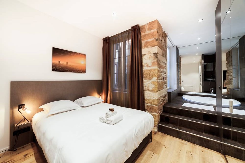 Magnificent new 3-room apartment of 70m2 in the heart of the center of Lyon, a stone's throw from Place des Terreaux. Exceptional by its location and its realization, you will find the perfect Lyonnais pied-à-terre for a tourist stay with family, couples or during a professional stay. Take advantage of the bubbles in the balneotherapy bath to recharge your batteries after a busy day!