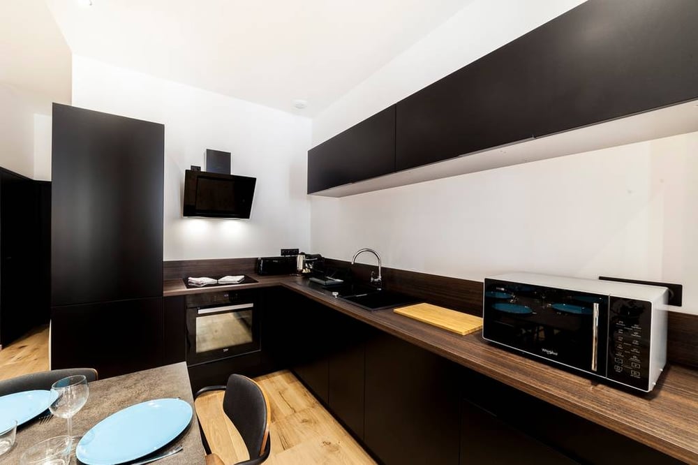 On the 2nd floor (no lift), this flat, which can accommodate up to 6 people, is the result of the division of a former 140 m2 dance hall that we have transformed into two top-of-the-range flats for your enjoyment. We've kept as much of the original stonework as possible, combining it with quality materials and furnishings to create the necessary charm. It comprises an entrance hall opening onto a large living room with a dining area, a granite table and six chairs with a contemporary design combining wood and metal, and a sitting area with a sofa bed for 2 people, 2 armchairs, a coffee table, a 117 cm flat-screen TV and a Wi-Fi connection for the entire flat. A fully-equipped kitchen with fridge, freezer, oven, induction hob, microwave, kettle, toaster, Nespresso coffee machine, filter coffee machine for the big drinkers, utensils, crockery and all you need for cooking. A master suite with double bed 160x200, ample storage space, wardrobe and shelving, wall-mounted flat-screen TV and a bathroom with whirlpool bath and washbasin. A second bedroom with double bed 160x200, ample storage space, wardrobe and shelving, a desk and wall-mounted flat-screen TV. A separate bathroom with double washbasin, Italian-style shower, washing machine/dryer and separate WC. For your comfort, the apartment is ready to welcome you. We provide hotel quality laundry (bed linen already placed on the beds and available for the sofa bed, towels, bath mat, tea towel) as well as 3 welcome kits for the first night / first morning: 1 bathroom kit for 2 people (1 shampoo, 1 shower gel, 1 soap, 3 make-up remover discs, 4 cotton swabs, 1 nail file); 1 edible kit for 2 people (2 coffee capsules, 2 tea bags, 2 cocoa sticks, 3 sweets, 2 mini-cookies); 1 maintenance kit for the living room (1 sponge, 1 washing machine tablet). Included in the cleaning fee.