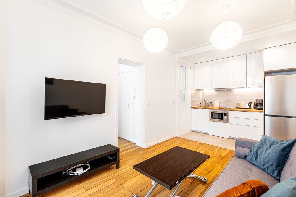 Welcome to my apartment! This 1-bedroom apartment in Paris is the perfect romantic getaway for couples. It offers a homely and intimate space for you and your loved one to enjoy. It is located on the second floor and is accessible by stairs. This apartment offers an open space plan with a fully equipped kitchen with essential cookware and cutleries that you'll need to cook delicious meals, such as a stovetop, a microwave, and a dishwasher, making it convenient to clean up after preparing a delicious meal. It is integrated into the living room, which features a comfortable sofa and a wide-screen TV to watch all your favourite shows. The apartment also has a washer and ironing equipment for your laundry needs. The property features a dedicated office space with a desk, armchair, and bookcase, making it ideal for remote workers or those who need to catch up on some reading. The bedroom has a double bed with complimentary hotel-quality linens, a wardrobe with hangers for all your storage needs, and an ensuite bathroom, providing privacy and convenience with all the necessary amenities, including clean towels, a hair dryer, a towel dryer and complimentary toiletries. The apartment is always professionally cleaned for your comfort. Enjoy your stay!