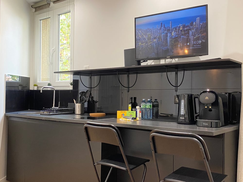 Welcome! Step into this charming and cozy studio, where a bright and elegantly decorated space awaits you. The apartment features a double bed (160x200), carefully prepared with hotel-quality linens and offering storage space underneath, as well as a TV for your entertainment. The fully equipped kitchen includes all the essential appliances and utensils for preparing your meals, such as a microwave, kettle and espresso machine. A washing machine is also available for your convenience. The bathroom is fitted with a sink, a mirror, a shower, and a toilet. Enjoy high-speed Wi-Fi throughout your stay. For your safety, a smoke detector is installed. The apartment is professionally cleaned between each stay. All that’s left to do is relax and enjoy!