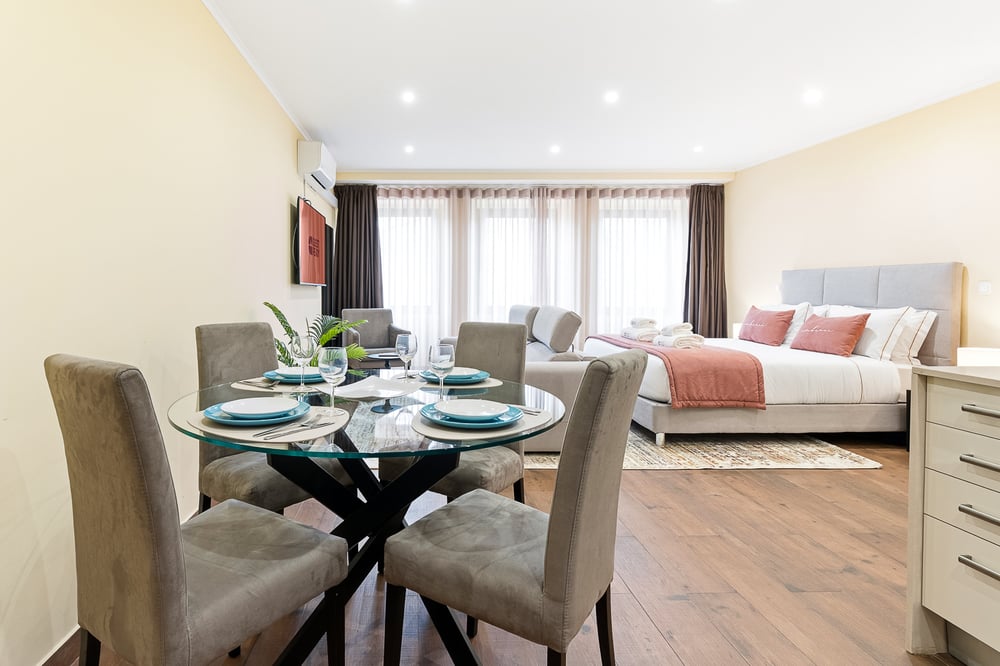 Welcome to my studio! Step into this well-designed studio, where a comfortable queen bed and a double sofa bed offer restful accommodations for up to 4 guests. The living area is thoughtfully arranged, featuring a TV for entertainment and WiFi access, perfect for streaming your favourite shows or catching up on work. The compact kitchen is equipped with all the essentials, including cooking utensils and cutlery, allowing you to prepare meals at your convenience. Enjoy a leisurely breakfast or a cosy dinner in the dining area, making it a delightful spot to start or end your day. The bathroom offers a refreshing shower experience, complete with towels and a hairdryer for your convenience. After a day of exploring the vibrant city, unwind on the private balcony, where you can savour the evening breeze and soak in the neighbourhood's lively atmosphere. Cleaning will be done before your anticipated arrival. Enjoy your stay! NOTE: The property is on a busy street, so there may be noise during the day.