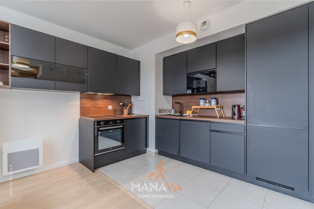 ✨ Manava Conciergerie presents Le Hiva Oa – Elegant duplex with terrace and green view Welcome to Le Hiva Oa, a stylish 80 m² duplex apartment located in a quiet, green residential area just minutes from Disneyland Paris. This bright and modern cocoon can accommodate up to 5 guests in a refined, cozy setting filled with natural light, thanks to its cathedral-style living room and large west-facing bay windows. 🌿 A natural setting with open views From the moment you enter, you'll be charmed by the green surroundings and the impressive ceiling height in the living area. The large windows flood the space with light all day long, while the furnished terrace extends the living room outdoors—perfect for a morning coffee or sunset aperitif. 🛋️ A bright and elegant cathedral-style living room The living space, decorated in a modern and minimalist style, features a comfortable sofa, designer armchairs, a contemporary TV unit with smart TV (Netflix included), and a cozy dining area around a beautiful wooden table. The entire room opens directly onto the terrace, creating a seamless indoor-outdoor flow. 👨🏻🍳 Open-plan, stylish, and fully equipped kitchen The matte black kitchen with wood accents is as beautiful as it is practical. It includes: - Oven, microwave, ceramic cooktop - Fridge-freezer - Dishwasher - Nespresso machine, toaster, kettle - Tableware, cookware, utensils, basic spices Perfect for preparing great meals, just like at home! 🛏️ Three comfortable and well-designed sleeping areas - Bedroom 1: King-size bed (180x200), large wardrobe, cozy terracotta-toned ambiance - Bedroom 2: Queen-size bed (160x200), small desk—ideal for remote work, with a soft and natural decor - Open mezzanine: Single bed (90x200), ideal for a child or teen, overlooking the living area Each bed comes with high-quality bedding to ensure a restful night’s sleep. 🌅 A perfect terrace for your relaxing moments Outside, a private terrace awaits you with wooden garden furniture: sofas, armchairs, and a coffee table for enjoying a drink or breakfast facing nature. 🛁 Bathroom & amenities - 1 bathroom with bathtub - Separate toilet - Washing machine - Heated towel rail 📶 Comfort & included amenities - High-speed Wi-Fi - Smart TV with Netflix - Electric roller shutters - Adjustable heating - Bed linen and towels for 5 guests - Welcome products for your first night (toilet paper, soap, coffee capsules, etc.) 🧼 Included upon arrival: - Sheets for each bed - 5 bath towels - 1 bath mat - 1 kitchen towel - Dish soap, sponge, dishwasher tablets - Shampoo, shower gel, hand soap - Coffee/tea capsules