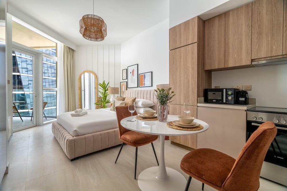 Bienvenido. Este encantador estudio de 39m2 está situado en la 7ª planta, accesible por ascensor. Diseñado con una sala de estar/dormitorio de planta abierta, el estudio está elegantemente amueblado y muy bien cuidado, con una zona de estar, un televisor para ver todos sus programas favoritos y una cómoda cama de matrimonio con sábanas de calidad de hotel para garantizar una buena noche de sueño. También está generosamente iluminado, perfecto para compartir momentos con su grupo. La zona incluye ventanales que dan a un balcón amueblado donde podrá relajarse plenamente. La cocina incluye electrodomésticos, así como utensilios de cocina y vajilla esenciales que satisfarán cualquiera de sus necesidades culinarias. Hay una lavadora disponible para sus necesidades de lavandería. El cuarto de baño tiene todas las comodidades necesarias para refrescarse, incluyendo toallas limpias y artículos de tocador para su comodidad. El estudio siempre se limpia profesionalmente para su comodidad. Si lo desea, puede solicitar un servicio de limpieza diario por un suplemento. Tenga en cuenta que Dubai es una ciudad dinámica y en rápida expansión, por lo que es posible que durante su estancia se encuentre con ruidos urbanos ocasionales, como los asociados al crecimiento en curso. Le agradecemos su comprensión. Tenga en cuenta que hay obras en curso frente al edificio, lo que puede causar algo de ruido. Gracias por su comprensión. Disfrute de su estancia.