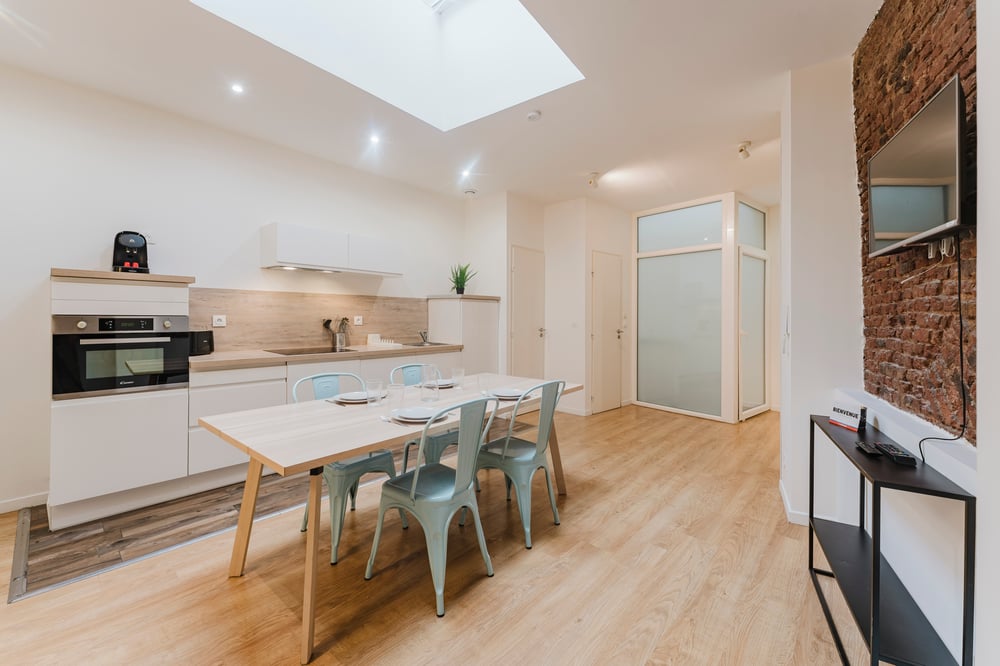 This apartment is located on the second floor (no elevator) of a typical Lille building. It comprises a pleasant living room with open kitchen and dining area, two bedrooms with double beds and a bathroom with shower and WC. The neighborhood is quite lively, so for light sleepers, we advise you to bring your earplugs! The accommodation will be carefully prepared for your arrival: Professional cleaning service + laundry service for household linen. All linen is provided: bed linen, bath towels, bath mats and tea towels. The kitchen is equipped with all utensils and dishes for lunch and dinner. Entertainment available via TV: Molotov TV, Prime Video! Please note that the staircase to access the apartment is typical of our pretty Lille buildings: the stairs are narrow, so we recommend that people with mobility difficulties take this into consideration. You'll appreciate the property for its facilities and proximity to shops, restaurants and transport in Lille!