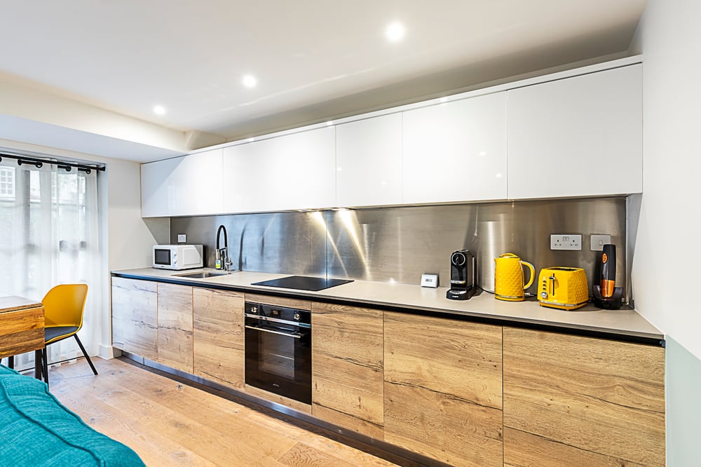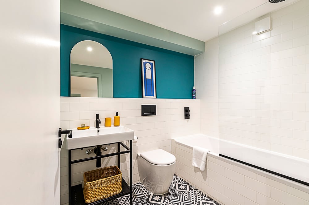 This charming ground-floor studio apartment in the heart of Greenwich offers an ideal London living experience. The cozy space features a double bed, separated from the living area by a block-out curtain for added privacy. The open-plan layout includes a stylish kitchen with sleek white and wood cabinetry, stainless steel finishes, and a modern living area with a deep blue sofa, plush armchair, and colorful accents. The room is decorated with a blue-patterned rug, creating a warm and welcoming atmosphere. The bathroom is well-appointed, with a wall-mounted shower over a bathtub for added convenience.