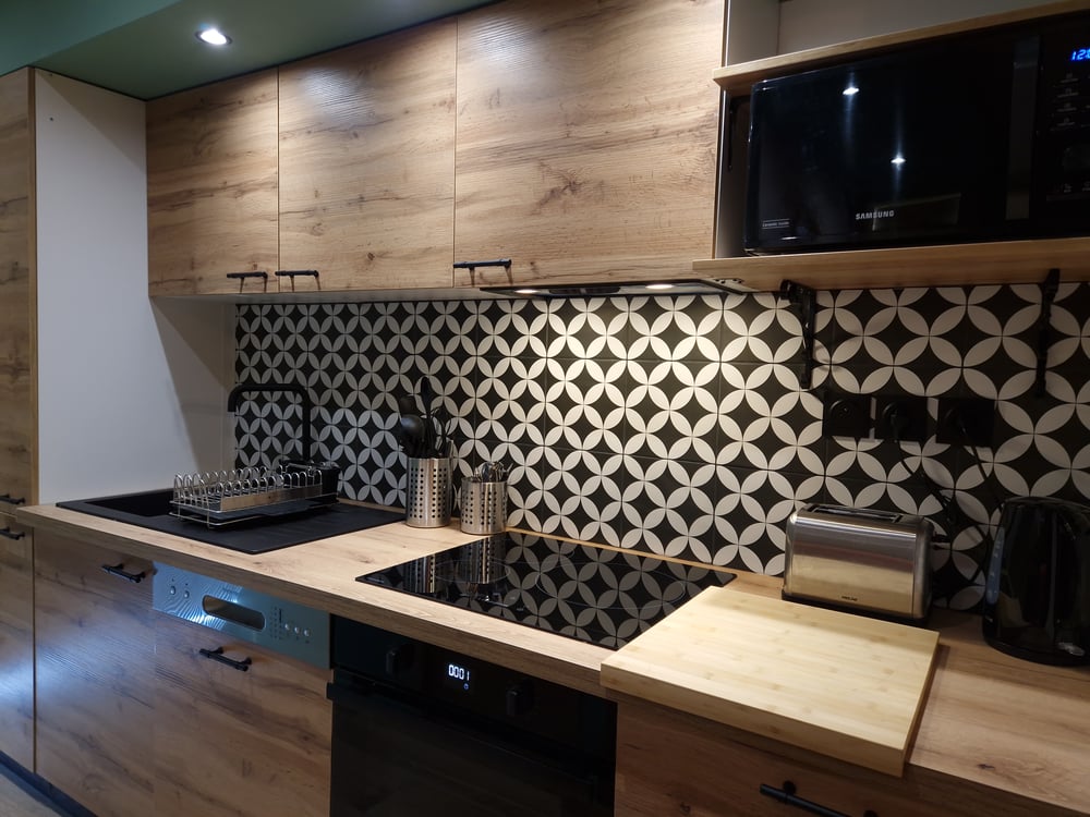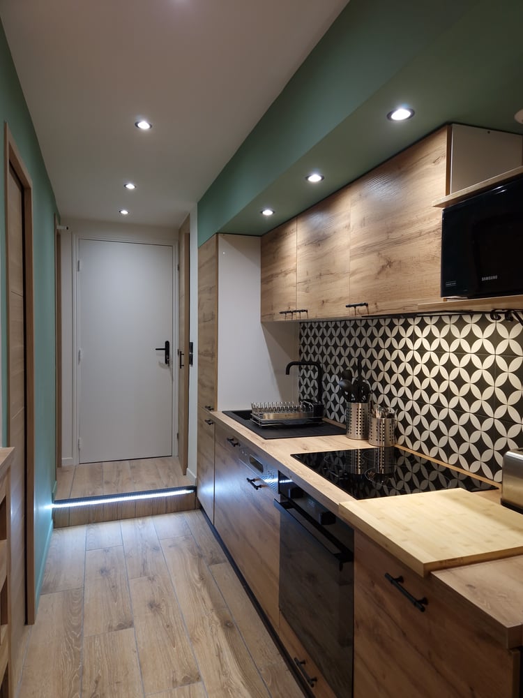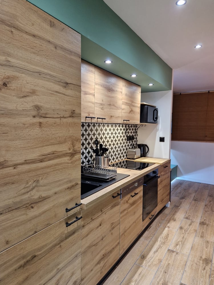 Nada más entrar en el piso, a su izquierda, encontrará un armario con todos sus útiles de limpieza, así como un espacio para colgar sus cosas en perchas e incluso guardar sus pertenencias. A tu derecha, al abrir la puerta corredera, encontrarás un aseo independiente. Frente a ti, tras un breve paseo, tendrás una vista de nuestra cocina totalmente equipada (frigorífico y congelador, lavavajillas, lavadora, placa de cocción, campana extractora, hervidor de agua, cafetera y utensilios de cocina en los armarios). Frente a la cocina hay una nueva puerta corredera que da acceso al cuarto de baño. Hemos instalado un espejo táctil para regular la iluminación, un toallero con tres perchas y un estante para guardar todos los productos de higiene. En la ducha, tienes dos opciones: un rociador extraíble o una ducha de lluvia. Por último, en la esquina de la ducha, encontrará un estante para guardar todos sus artículos de ducha. Vuelva a la zona principal, que le da acceso a la sala de estar y a la mesa contra la pared. Tanto para comer como para trabajar, le encantará este espacio optimizado y bien iluminado. En el extremo de nuestra mesa, hemos colocado vasos, tazas y otros utensilios. Junto a esta zona de comedor/trabajo, el sofá convertible mira hacia la Smart TV, colocada a una distancia perfecta.