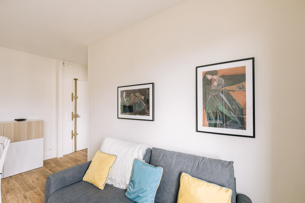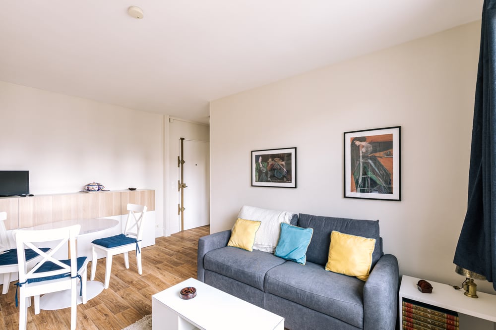 ¡Bienvenido a mi casa! Luminoso y espacioso, este apartamento de un dormitorio de 42 m² está situado en la sexta planta de un edificio residencial (con ascensor), totalmente equipado para una estancia confortable en París. En nuestra casa, su salud y su seguridad son lo primero. Seguimos un protocolo de limpieza reforzado, con limpieza profesional y desinfección estratégica. - una sala de estar con un cómodo sofá y una mesa de comedor que sirve también como espacio de trabajo - una cocina totalmente equipada con todos los electrodomésticos necesarios (cocina, nevera, microondas, cafetera, hervidor de agua) - un bonito dormitorio con cama de matrimonio y sábanas de calidad hotelera - un cuarto de baño limpio y agradable con aseo y ducha a ras de suelo Toallas y ropa de cama de calidad para su comodidad. Esperamos que disfrute de su estancia.