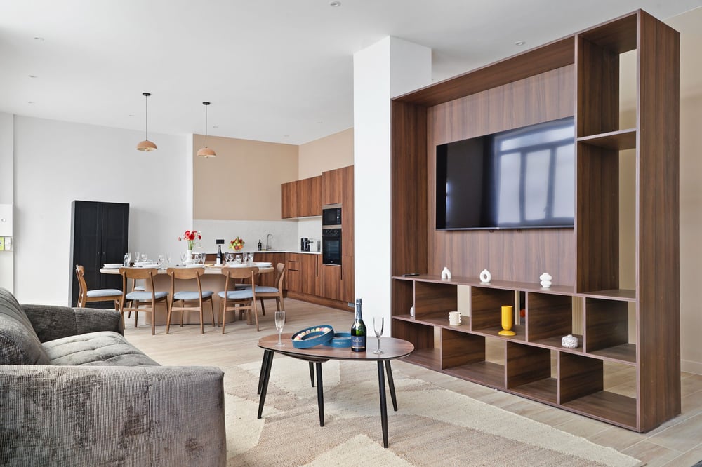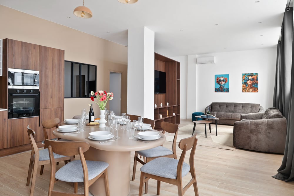 In the heart of Paris, a 20-minute walk from the Eiffel Tower, discover this magnificent, brand-new (March 2026) apartment, fully air-conditioned and designed by an interior architect. Bright, spacious, and designed to accommodate up to 12 guests in luxury comfort, it’s perfect for a memorable stay in Paris with family or friends. A 120-square-meter air-conditioned apartment on the ground floor overlooking a quiet courtyard, in a secure building, featuring: - 1 Large, spacious living room with two comfortable double sofa beds, a coffee table, and a large smart TV - 1 Beautiful dining table with chairs for 12 people - 1 Fully equipped open kitchen (stove, oven, microwave, toaster, Nespresso machine, kettle) - 2 bedrooms with queen-size beds, TVs, walk-in closets, and private bathrooms with showers - 2 bedrooms with queen-size beds, TVs, and custom-built walk-in closets - 1 separate bathroom with a shower, vanity, and toilet - 2 separate toilets Additional amenities: Wi-Fi, dishwasher, washer-dryer. Please note: Two bedrooms have no windows and are designed as ideal cocoons for rest. Cleaning fees include fresh sheets and towels for each guest, and cleaning is performed by a professional housekeeper. Come discover the timeless charm of Paris from our apartment. Book today and get ready to experience unforgettable moments in the City of Light.