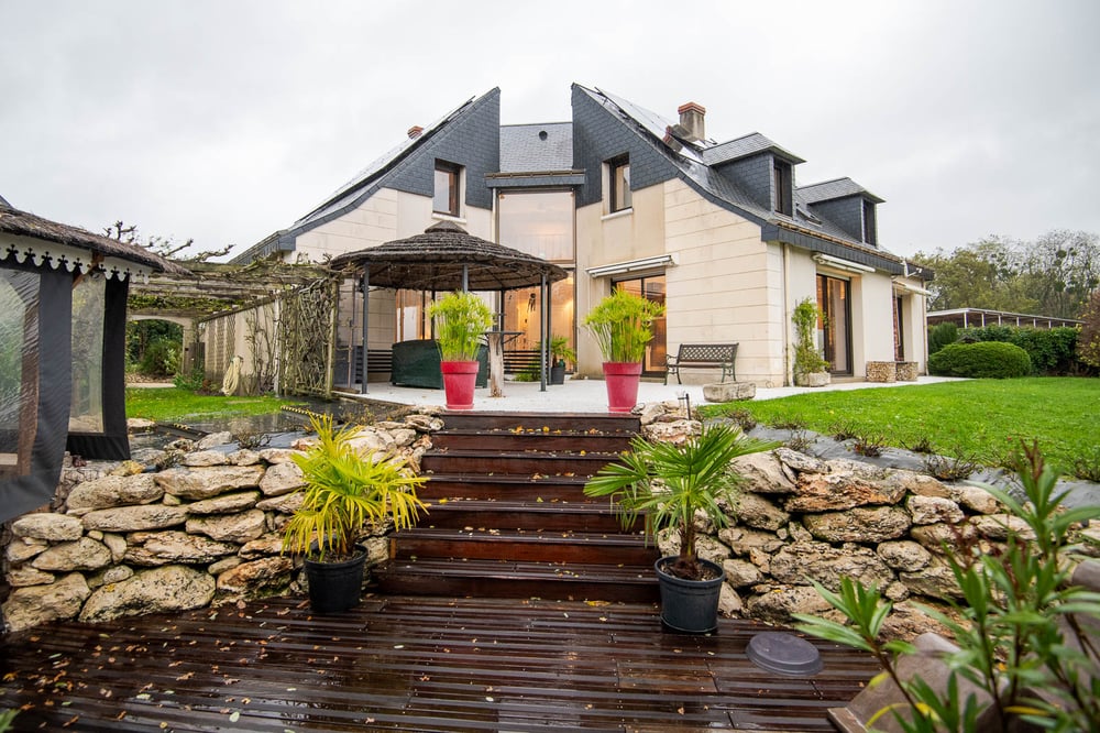 Découvrez cette superbe villa aux matériaux de qualité et aux prestations luxueuses, offrant un cadre idéal pour un séjour inoubliable. Au cœur de son parc arboré, vous pourrez flâner dans une charmante roseraie et profiter d’un terrain de pétanque. Tout y est pensé pour votre confort : un espace détente complet vous attend, avec une piscine à contre-courant couverte disposant deux aquabikes, un hammam, et une douche intérieure. Vous trouverez également une cuisine d’été, typique Boucan de la Réunion, parfaite pour préparer de délicieux repas à savourer sous la Paillote, entourée de salons de jardin et de transats à l’ombre de parasols exotiques pour profiter de la douceur tourangelle. Dès l’entrée, vous serez accueillis par un majestueux hall en marbre s’ouvrant sur le jardin. Élégante et moderne, cette entrée mène à un salon-salle à manger aux volumes généreux, orné d’une grande cheminée en pierre de Tuffeau. Installez-vous confortablement dans les canapés en cuir, profitez de la vue sur le jardin, ou reposez-vous dans un fauteuil relaxant avec un livre. La décoration, soignée jusque dans les moindres détails, a été pensée pour votre bien-être. Un grand écran plat et un lecteur DVD sont à votre disposition pour vos moments de détente, accompagnés d'une table basse parfaite pour des apéritifs conviviaux. Dans la continuité, la salle à manger ultra moderne et son buffet s’ouvrent sur le jardin par une vaste baie vitrée. La cuisine américaine, équipée d’appareils modernes (four, micro-ondes, réfrigérateur-congélateur, gazinière, robot ménager, grille-pain, cafetière Senseo et classique), ravira les amateurs de cuisine. Un grand plan de travail et un coin repas sont également aménagés pour les petits-déjeuners ou repas sur le pouce. Un kit de bienvenue pour la cuisine (éponge, produit vaisselle, sac-poubelle, et torchon) est offert pour la première nuit. La chambre principale de plain-pied invite au repos avec son accès direct au jardin par une baie vitrée. Elle est aménagée d’un lit double, de tables de nuit, d’une commode et d’un téléviseur. Un couloir avec rangements mène à la salle de bain privative, équipée d’une baignoire, d’une douche, de double vasques, et de toilettes séparées. Un nécessaire de toilette pour la première nuit (gel douche, shampoing, papier toilette) est également inclus. À l’étage, accessible par un élégant escalier en fer forgé, se trouve l’espace nuit pour famille et amis. Une première chambre lumineuse avec lit double et rangements avec penderie donne vue sur le parc arboré et la piscine. Une mezzanine avec billard invite à des moments de convivialité, et un espace bureau permet de travailler confortablement. La seconde chambre, aux tons modernes, est idéale pour les enfants, avec lit double et espace cosy. Une troisième chambre spacieuse, décorée de meubles de charmes avec penderie, complète cet étage, offrant à vos invités un cadre agréable et fonctionnel. Pour l’étage, une grande salle d’eau est à disposition avec douche, double vasques, sèche-serviettes et toilettes. Un nécessaire de toilette pour la première nuit est également prévu. La literie et le linge de maison (draps, serviettes de bain, tapis de bain) sont fournis, et la maison sera parfaitement propre et désinfectée pour votre arrivée, dans le respect des mesures sanitaires.