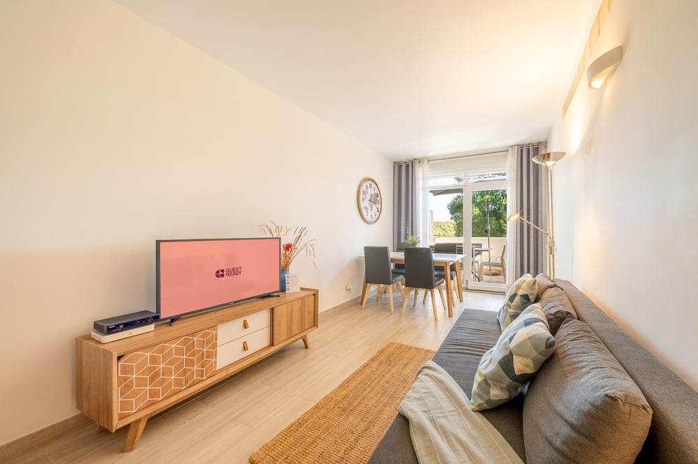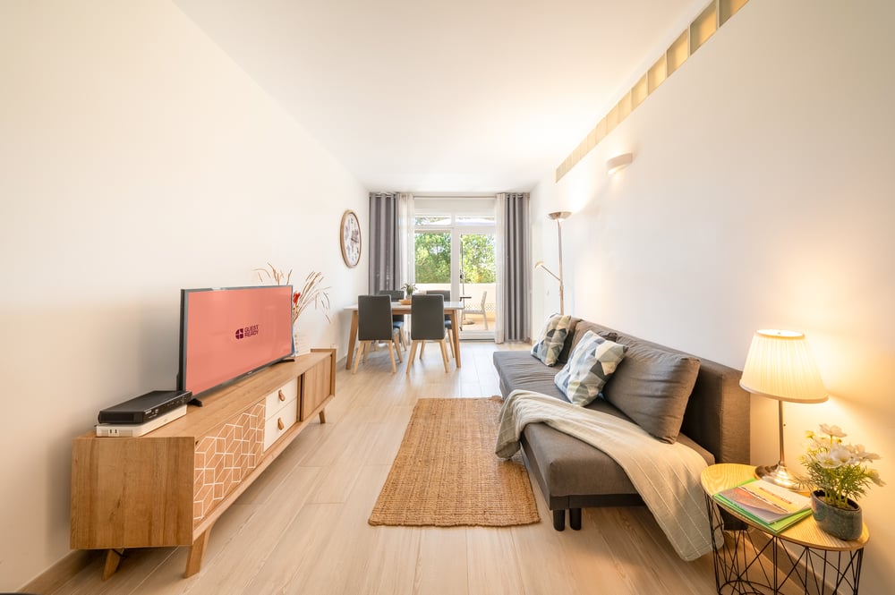 Welcome! This charming apartment with a balcony, decorated to provide comfort and make you feel at home, is the perfect starting point to explore one of Portugal's treasures, the Tróia peninsula. Ideal for families, this apartment features a living room equipped with a comfortable sofa and TV, perfect for relaxing, and also features a bright dining area by the window that gives access to the balcony where you can also gather the family outdoors at the outdoor table. The kitchen is fully equipped to prepare all daily meals. In addition to basic dishes and utensils, the kitchen features a kettle, coffee machine, microwave, oven, stove hob, fridge, and dishwasher to help you in your daily life. The sleeping area consists of two harmoniously decorated bedrooms. One of the bedrooms has a double bed and the second bedroom has a bunk bed, ideal for children or friends. All beds come with quality linens to ensure maximum comfort. The bathroom features all amenities, including a shower, towels, and toiletries for your convenience. There is also a washing machine located in the apartment's pantry. The space is always professionally cleaned. Enjoy your stay!
