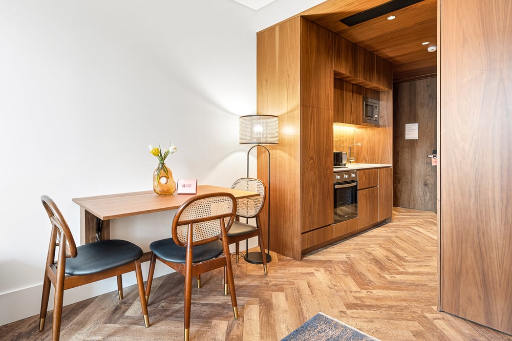 Bienvenue ! Cet élégant et chaleureux studio, décoré pour offrir un confort maximal et vous faire vous sentir chez vous, est le point de départ idéal pour explorer la ville et ses attractions. Idéal pour les petits groupes, ce logement dispose d'une cuisine ouverte sur le salon et la zone couchage. Avec des détails en pierre d'origine près de la fenêtre, l'espace de vie et de couchage est équipé de deux lits simples, d'une télévision, d'une table à manger et d'un confortable canapé jaune qui fait office de lit simple, parfait pour se détendre. La cuisine, avec ses armoires en bois et son panneau de carreaux jaunes, est entièrement équipée et idéale pour préparer tous les repas quotidiens. En plus de la vaisselle et des ustensiles de base, la cuisine dispose d'une bouilloire, d'un grille-pain, d'une cafetière, d'un micro-ondes, d'un four, d'une plaque à induction et d'un lave-vaisselle. En prime, le bâtiment offre un accès à une superbe piscine intérieure partagée, le refuge idéal pour se détendre et se ressourcer. Tous les lits sont équipés de linge de qualité pour garantir un confort optimal. La salle de bain dispose de toutes les commodités, notamment des serviettes et des articles de toilette pour votre confort. L'espace est toujours nettoyé professionnellement. Veuillez noter que le bâtiment est situé sur l'une des principales avenues de la ville, où la circulation est exclusivement piétonne. Profitez de votre séjour !