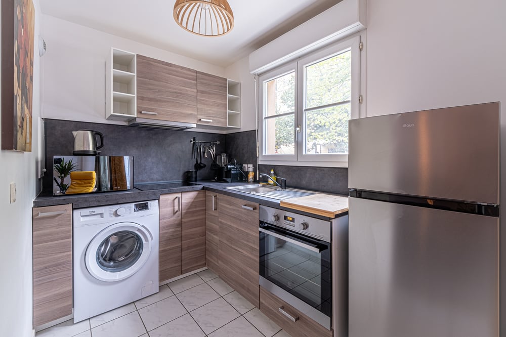 Le logement comprend : _ Un Séjour avec Canapé Convertible, TV Netflix etc… une table à manger pour 4 personnes _ Canapé Convertible 160*200 confort _ Une Cuisine Équipée (Four, Micro-Onde, Grille Pain, Cafetière Nespresso, Bouilloire,Lave vaiselle, Frigo, Congélateur) _ 1 Chambre avec lit double 160*200 TV également et placard de rangement pour les vêtements _ Salle de bain avec Baignoire et WC _ Machine à laver avec Étendoir _ Wifi Internet _ Linge de lit et draps de bain fournis