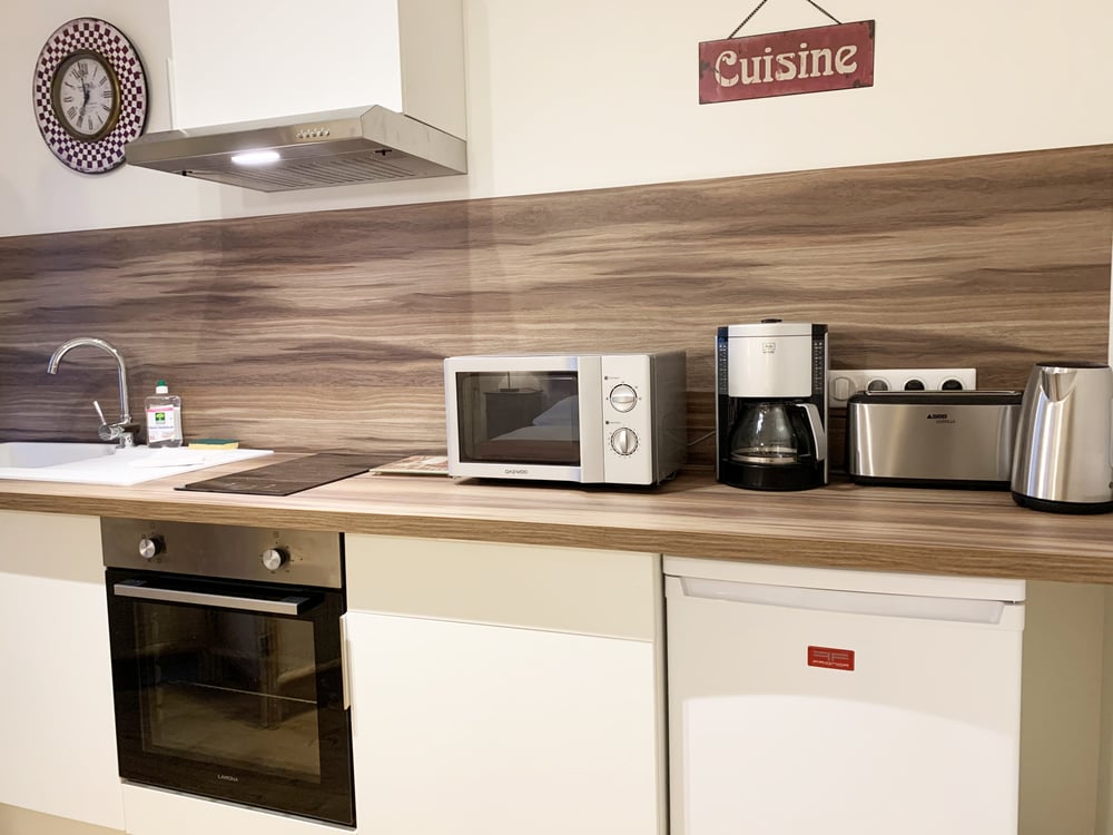 This pretty renovated studio just a few steps from the Chartres cinema in a pedestrian street can accommodate two travelers. Located in a quiet courtyard it will be the ideal accommodation to come and discover the tourist richness of Chartres. The kitchen is very well equipped (oven - hob - coffee machine - toaster - kettle). The bathroom is composed of a shower, a washbasin and a toilet. The living room has a dining table for two persons and a bed of 160 cm. Wifi is available in the accommodation. Your personal digital welcome booklet will be sent to you as soon as your reservation is confirmed. You will find all the useful information for your stay (tourist information and good addresses) as well as the concierge services we offer. The plus is the hotel quality of the linen included in the rental (sheet - cover - towel - bath mat and tea towel)