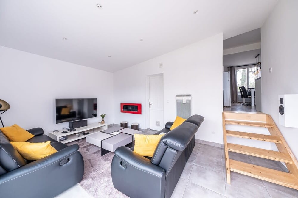 La maison est en plusieurs parties : Au rdc : _ Salon coin Tv + Petite Console De Jeux + Une Grande Chambre _ Salle à Manger et Cuisine Équipée À l'étage : _ Salle de Bain et Dressing _ Au 2 ème étage 2 Chambres chacune avec Lit double _ Internet Wifi Lors des beaux jours vous pouvez profiter de la terrasse extérieure avec barbecue et du mobilier à disposition pour vos repas.
