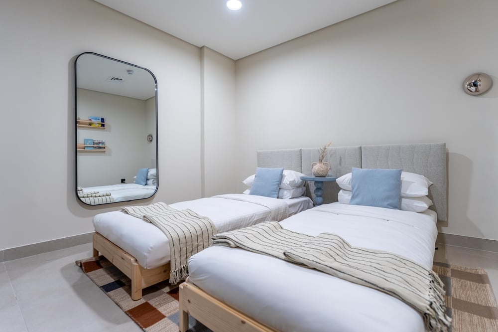 Welcome to your luxurious retreat! This stunning apartment on the 4th floor offers exceptional comfort and modern design. With vibrant, coloured lighting to set the mood, it’s the perfect spot to unwind and enjoy the views. Ideal for families or small groups, the spacious living room is furnished for relaxation, featuring a cozy sofa, a large TV for your entertainment, and a dining area perfect for group meals. The room is bathed in natural light thanks to the expansive floor-to-ceiling windows that open onto the balcony, where you can relax with the views. The kitchen is a true highlight, featuring sleek, touch-enabled cabinets and all the appliances you need, from a stovetop to a washer, allowing you to cook and feel at home with ease. The two beautiful bedrooms are designed to provide maximum comfort. The master bedroom features a king-size bed and an en-suite bathroom for added privacy. The second bedroom offers 2 single sized beds, making it ideal for additional guests or family members. Both rooms are tastefully decorated and equipped with hotel-quality linens to ensure a restful night’s sleep. The bathrooms are fully equipped with fresh towels, toiletries, and everything you need to feel refreshed and pampered during your stay. For your convenience, daily housekeeping services are available upon request (additional fee applies). We ensure the apartment is professionally cleaned between each stay to maintain the highest standards of cleanliness. Please note, Dubai is a vibrant and ever-growing city, and with these developments come occasional construction in the apartment building or surrounding area. While this may bring some urban sounds or affect the views from the property, it is all part of the city’s dynamic growth. We truly appreciate your understanding and look forward to hosting you. Enjoy your stay!