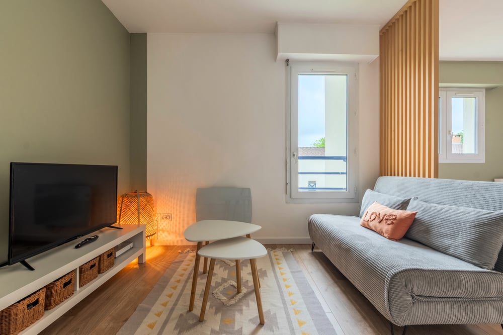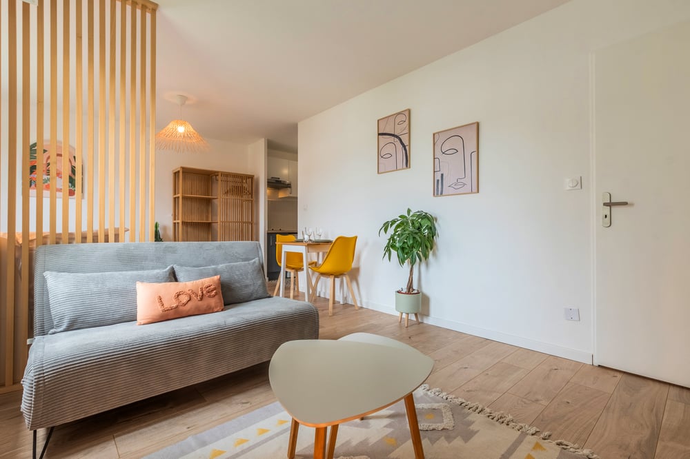 L'appartement est composé comme suit : - WC séparé directement après la porte d'entrée - Salle de bain avec baignoire et lavabo - Pièce de vie avec espace salon, espace nuit (lit double en 140x200) et cuisine équipée ouverte Le logement sera soigneusement préparé pour votre arrivée : Service de ménage professionnel + blanchisserie pour le linge de maison. L'ensemble du linge est fourni: linge de lit, serviettes de bain, tapis de bain et torchons. La cuisine est équipée avec tous les ustensiles et plats pour déjeuner et diner. Voici les divertissements à votre disposition via la tv : Molotov TV et Prime Video.