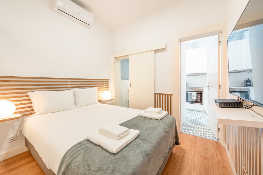 Suite au sous-sol avec un lit double, une salle de bains privée et une cuisine dédiée, située dans le quartier tranquille d'Ajuda, à l'ouest de Lisbonne.
