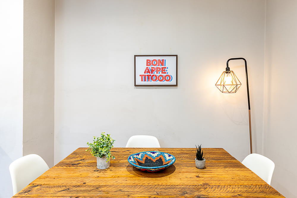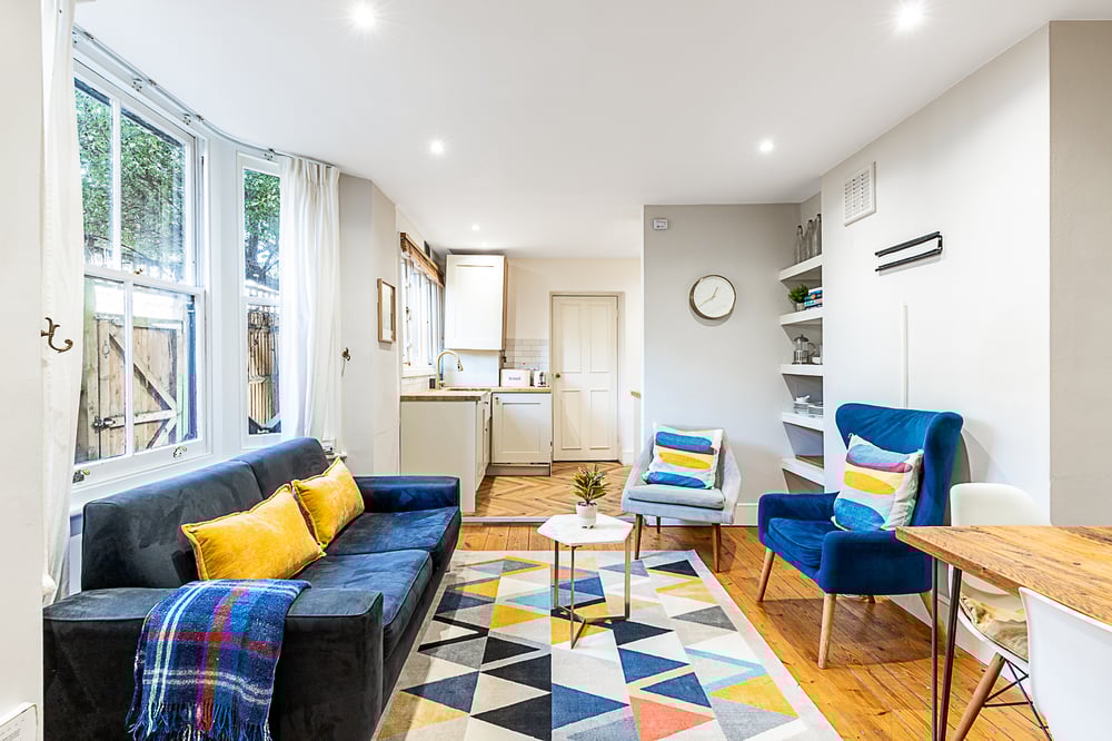 This charming Brixton flat offers a warm and contemporary retreat in one of London’s most vibrant neighbourhoods. Thoughtfully styled with inviting colours, natural textures and modern touches, it is the ideal base for guests looking to enjoy comfort, character and excellent access to the city. The home accommodates four guests across two calming bedrooms, fitted with a king sized bed and a double sized bed designed for rest and relaxation. It features one well-appointed bathroom with a combined bath and shower, along with a separate WC for added convenience. Set on the ground floor, the flat offers an easy and practical layout for couples, families or friends travelling together. The living spaces are beautifully curated, blending modern lines with playful pops of colour to create a boutique-apartment feel. A plush navy sofa and bright cushions sit beneath large bay windows, allowing soft natural light to fill the room and highlight the wooden floors and carefully chosen artwork. The dining area provides a welcoming space for shared meals or relaxed evenings in. The contemporary kitchen continues the stylish theme with sleek cabinetry, warm wooden worktops and high-quality appliances, including a Nespresso machine for effortless morning coffees. Beyond the living area lies a private garden, a rare find in London, offering a peaceful outdoor corner with seating surrounded by mature greenery, perfect for unwinding after a day exploring the city.