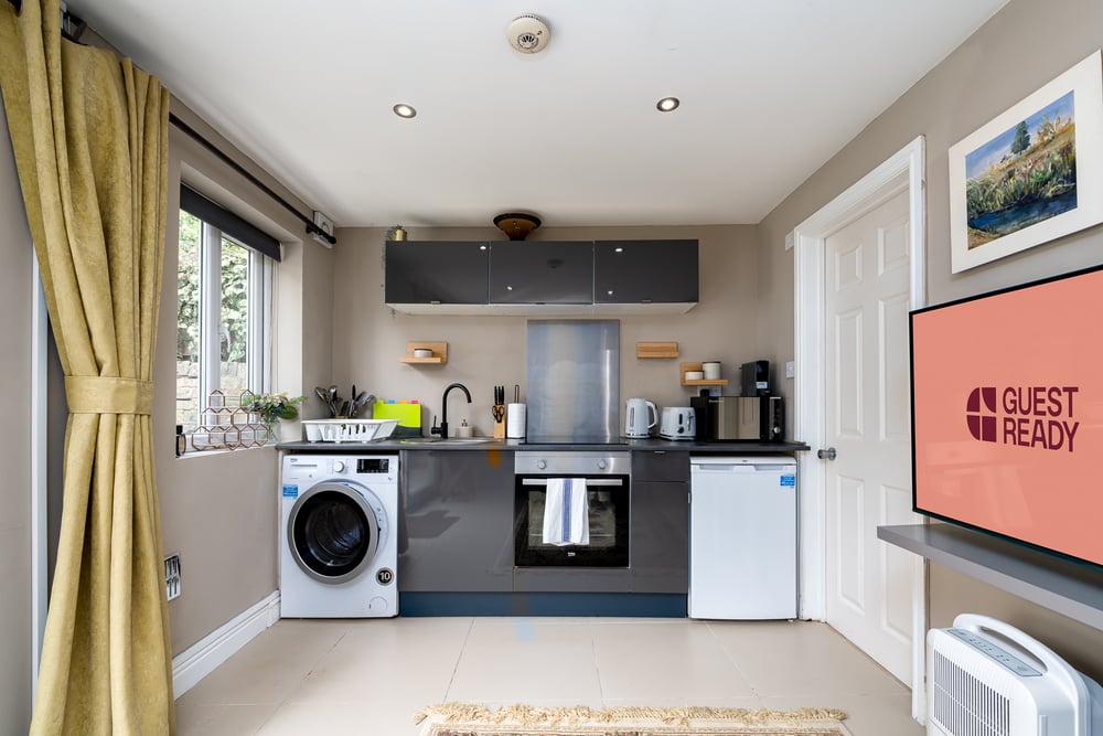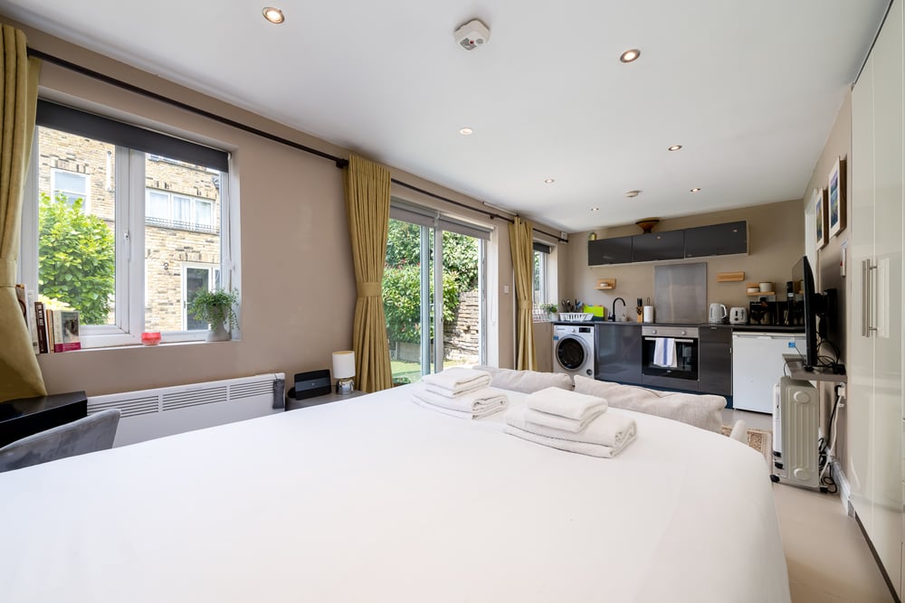 Welcome! This lovely 15m2 studio is located on the ground floor. Designed with an open-plan layout, this studio seamlessly combines living and sleeping areas. It's tastefully furnished and well-maintained, offering a homely sitting area and a smart TV for your entertainment needs. The comfortable double bed is dressed in hotel-quality linens to ensure a restful night's sleep. The shared garden offers a picturesque setting, inviting residents to relax and unwind amidst its natural beauty. The kitchen includes appliances, essential cookware, and cutleries to fulfil your culinary requirements. Plus, there is a washer available for your laundry needs. The bathroom has all the amenities you will need to freshen up, including fresh towels and toiletries for your convenience. The studio is always professionally cleaned for your comfort. Enjoy your stay!