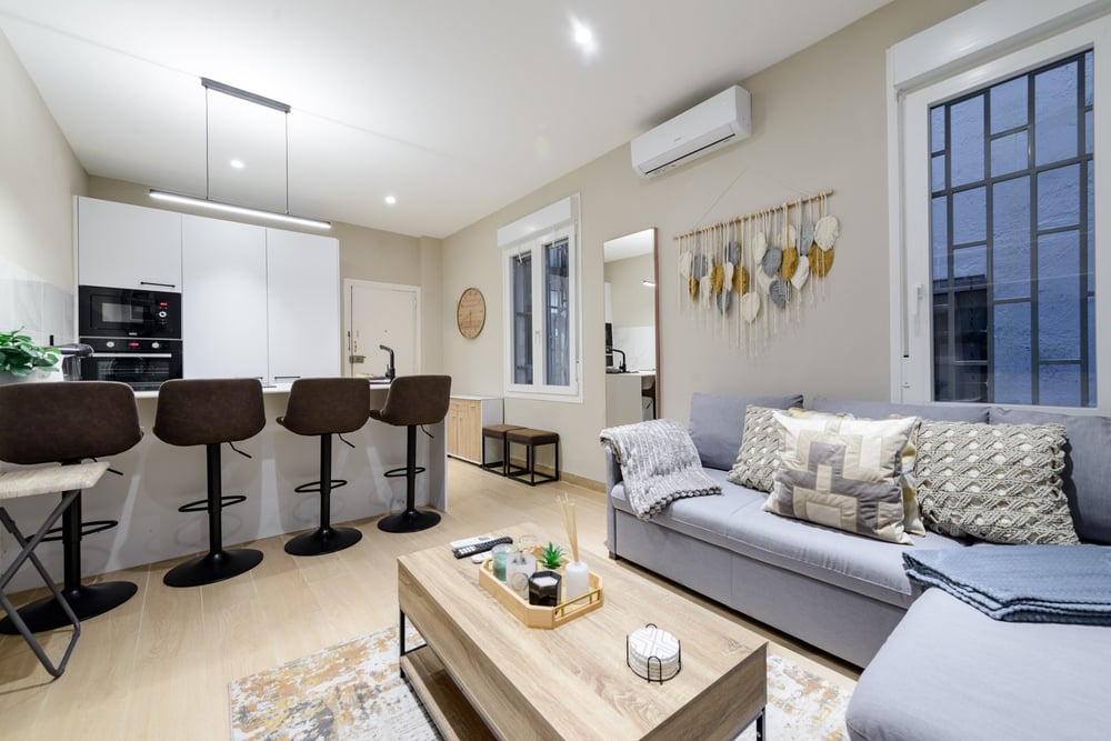 Welcome to my home! This charming 50m² apartment is modernly decorated and ideally located in one of the most exclusive and beautiful areas of Madrid. The living room features a comfortable double sofa bed perfect for relaxing, smart TV and a dining table with high chairs. The kitchen is fully equipped with everything you need, including an electric hob, oven, microwave, coffee maker, and much more. There is also a washing machine. The first bedroom has a cozy double bed and closet, while the second bedroom includes a comfortable twin bed that converts into a double bed. All beds are equipped with linens. The bathroom is equipped with everything needed to freshen up, including towels and toiletries. Please note that this space is small, so it is worth taking into account. To top it off, the space is professionally cleaned to ensure your comfort and satisfaction.