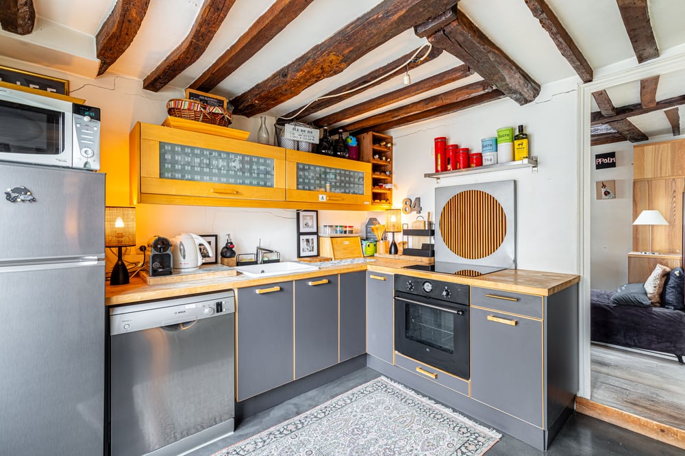 Bienvenue dans mon appartement ! Situé au 5ème étage avec accès par escalier, cet appartement chic est idéalement situé à proximité des principales attractions de Paris, telles que la Sainte-Chapelle et Notre Dame ! Conçu avec un plan d'étage ouvert, le salon dispose de canapés confortables, d'une télévision intelligente pour profiter de vos émissions préférées grâce à de multiples options de streaming, et d'une table à manger pour deux personnes. La cuisine dispose d'ustensiles de cuisine et de couverts essentiels pour de délicieux repas, y compris une cuisinière, un four et un four à micro-ondes. L'appartement dispose également d'une machine à laver et de matériel de repassage pour vos besoins en linge. La chambre à coucher dispose d'un lit double avec des draps de qualité hôtelière gratuits pour un confort maximal. L'appartement est toujours nettoyé par des professionnels pour votre confort. Profitez de votre séjour !