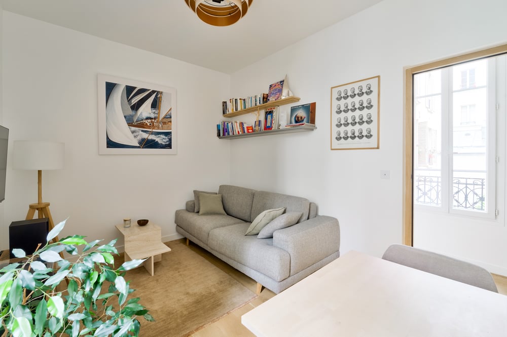 Charmant et calme appartement avec vue sur la cour, comprenant un grand lit double, un canapé-lit, une télévision, un coin repas, une cuisine entièrement équipée et une spacieuse douche à l'italienne. Idéal pour les couples ou les voyageurs solo en quête de confort et de charme parisien.