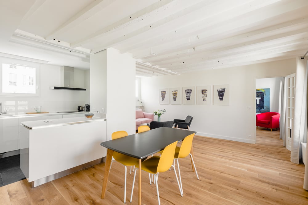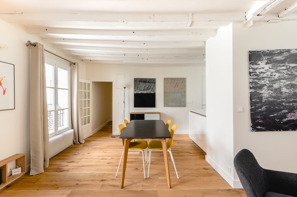 Vous serez charmés par un immeuble typique du Marais avec une cour pavée et un appartement entièrement rénové dans une ambiance d'oeuvres d'art.