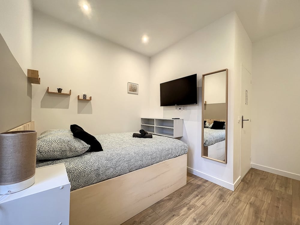 Le logement Situé au rez-de-chaussée d'un immeuble fraichement rénové à neuf, ce logement comprend : - Une pièce très lumineuse avec un lit de 140x190, une table + chaise, une tv connectée, un dressing - Une kitchenette équipée avec plaques à induction, réfrigérateur (compartiment congélateur), micro-onde, cafetière et bouilloire - Cafetière Dolce Gusto (Pack accueil de 2 capsules + 2 sachets thé) - Une salle de bain avec une douche, un meuble vasque et toilette. Un sèche-cheveux, table et fer à repasser sont disponibles dans le logement. Vous avez accès direct à une terrasse privative. Cet appartement a une capacité maximale de couchage de 2 personnes. Il est donc interdit d’accueillir un nombre de personnes supérieur à cette capacité maximale. Le logement bénéficie d’une connexion Wi-Fi gratuite