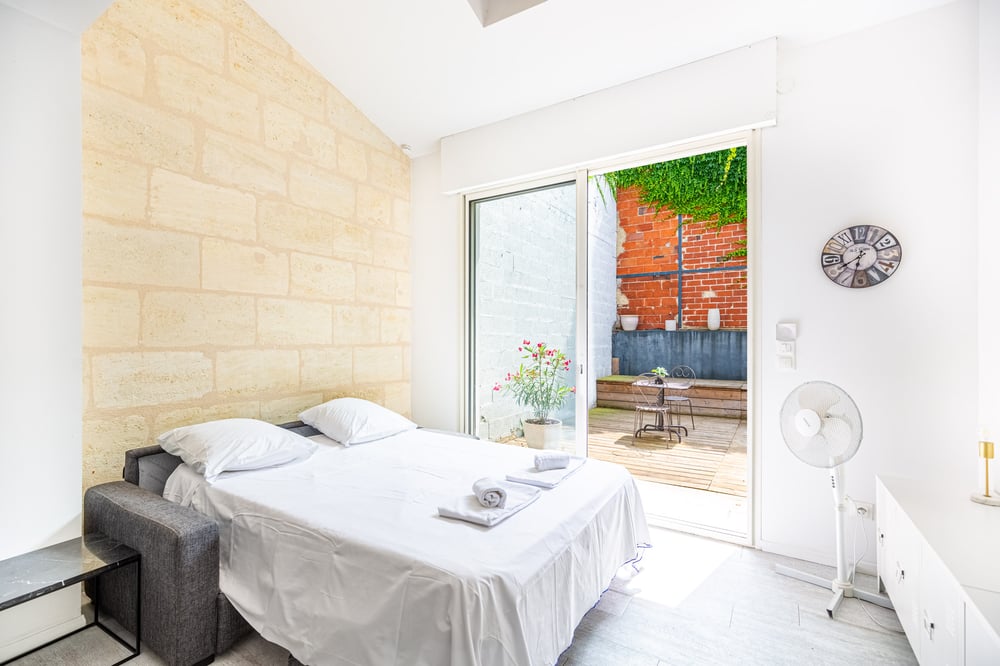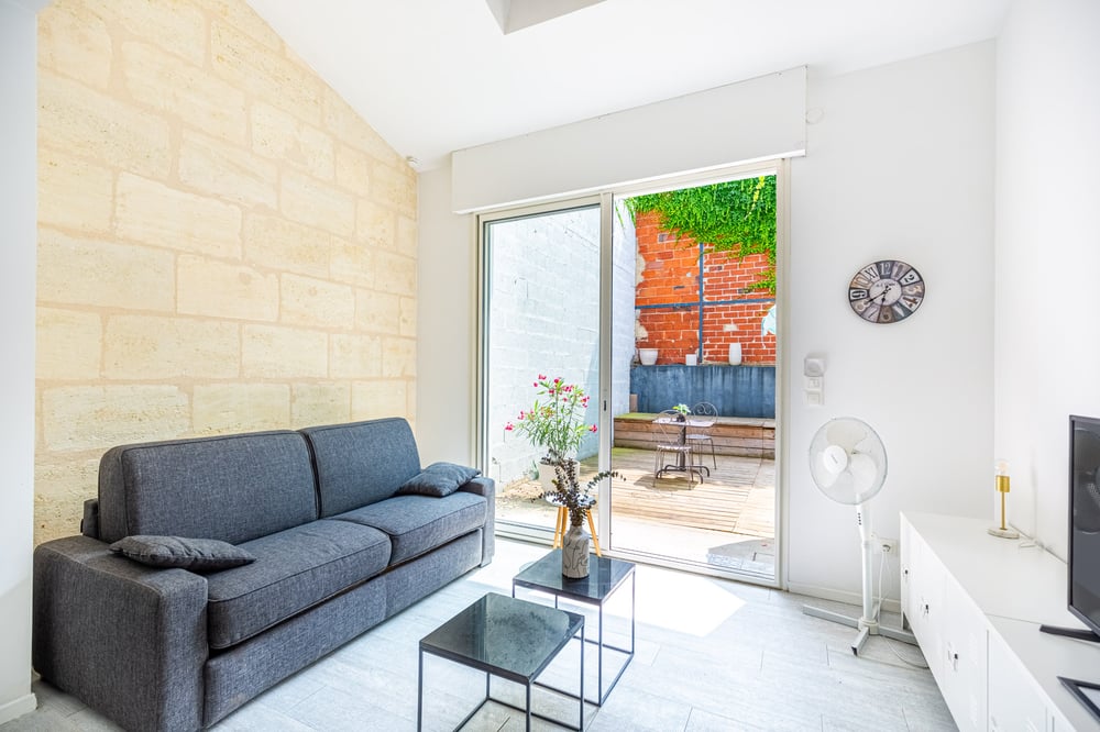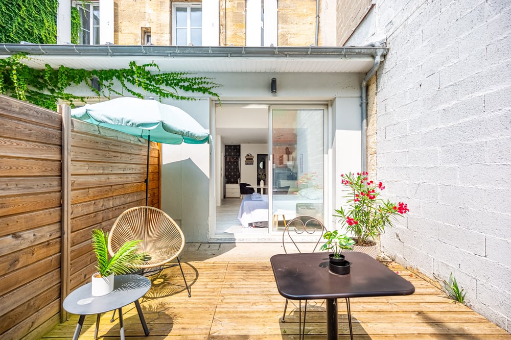 This 25m2 flat comfortably sleeps 2 people, is attractively decorated and has a landscaped terrace with trees. It is ideally located in the Gare Saint Jean district of Bordeaux, with public transport just down the road.