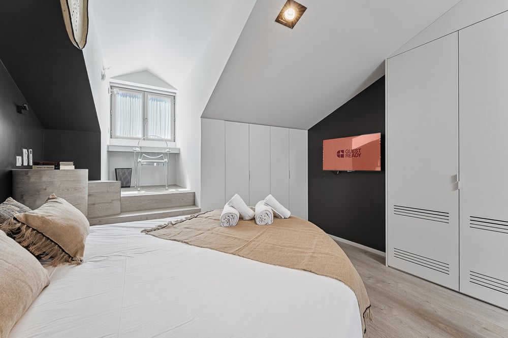 Welcome to my apartment! This stylish 45 m² two-bedroom apartment in Braga is the perfect retreat for families and friends looking for a comfortable and memorable stay. Located on the third floor and accessible by lift, the apartment combines innovative design with comfort. The open-plan living area includes a comfortable seating area and a wide-screen TV, which is ideal for relaxing evenings and catching up on your favourite shows. Up on the mezzanine level, you'll find a king-sized bed dressed in hotel-quality linens, along with a private ensuite bathroom for your comfort and convenience. The adjoining kitchenette comes fully equipped with everything you need to prepare delicious meals, including a stove, oven, microwave, cookware, and cutlery. A dishwasher is also available to make cleaning up effortless, along with ironing equipment for added convenience during more extended stays. The bedroom features two single beds with hotel-quality linens to ensure a good night's sleep and an ensuite bathroom. All the bathrooms contain all the necessary amenities, including clean towels, a hair dryer and complimentary toiletries. The apartment is always professionally cleaned for your comfort. Enjoy your stay!