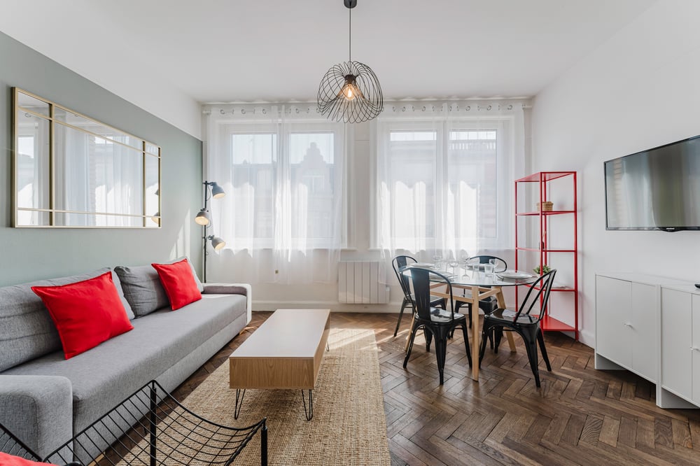 The appartment comprises a light-filled living room, a fitted kitchen, two separate bedrooms and a bathroom with shower. There is a non-convertible sofa in the living room for the fifth person. The curtains are not all blackout, so we recommend that people who are sensitive to light wear a mask. You will appreciate this spacious accommodation for its location and will be well prepared for your arrival: Professional cleaning service + laundry for household linen. All linen is provided: bed linen, bath towels, bath mats and tea towels. The kitchen is equipped with all utensils and dishes for lunch and dinner. Entertainment available via TV: Molotov TV, Prime Video! The flat is on the fifth floor of a building with a lift. Ideal for a stay with family or friends!