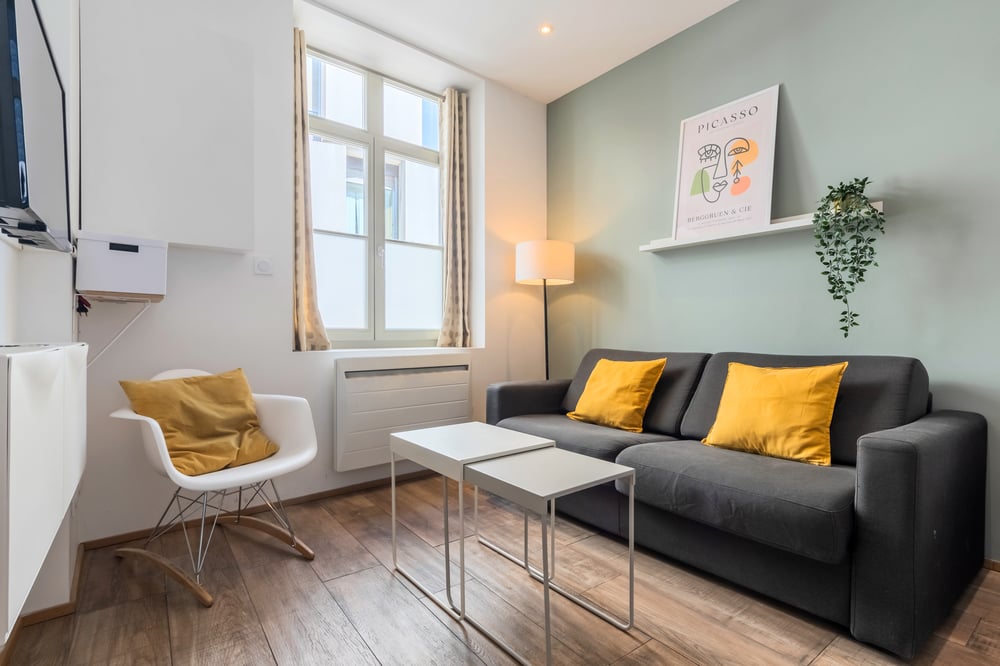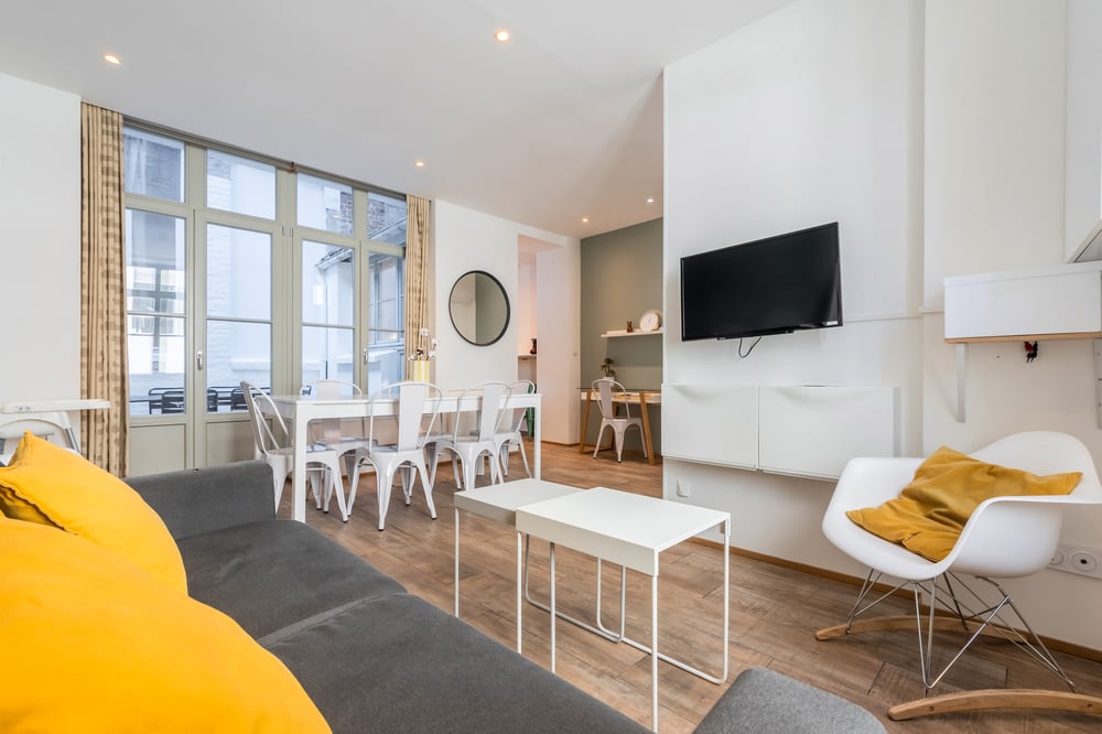 Please note that the stairs in this apartment are typical of our beautiful Lille buildings: we therefore recommend that families with young children or people with mobility difficulties take this into consideration before booking. The house is located in the heart of Old Lille, on a cobbled alleyway typical of Lille. This beautiful 80m² space is composed as follows: Ground floor: - Living room with lounge and dining room - Equipped kitchen - Small interior courtyard - WC First floor: - Two bedrooms with double beds (140 x 200 cm) - A bathroom with bathtub, double sink, and washing machine Second floor: - Dressing room - A bedroom with two single beds The layout of the apartment allows a group of business travelers, a family, or friends to feel right at home! Professional cleaning service + laundry service for household linens. All linens are provided: bed linens, bath towels, bath mats, and tea towels. The kitchen is equipped with all the utensils and dishes for lunch and dinner. Here's what entertainment you can enjoy on the TV: Molotov TV, Prime Video!