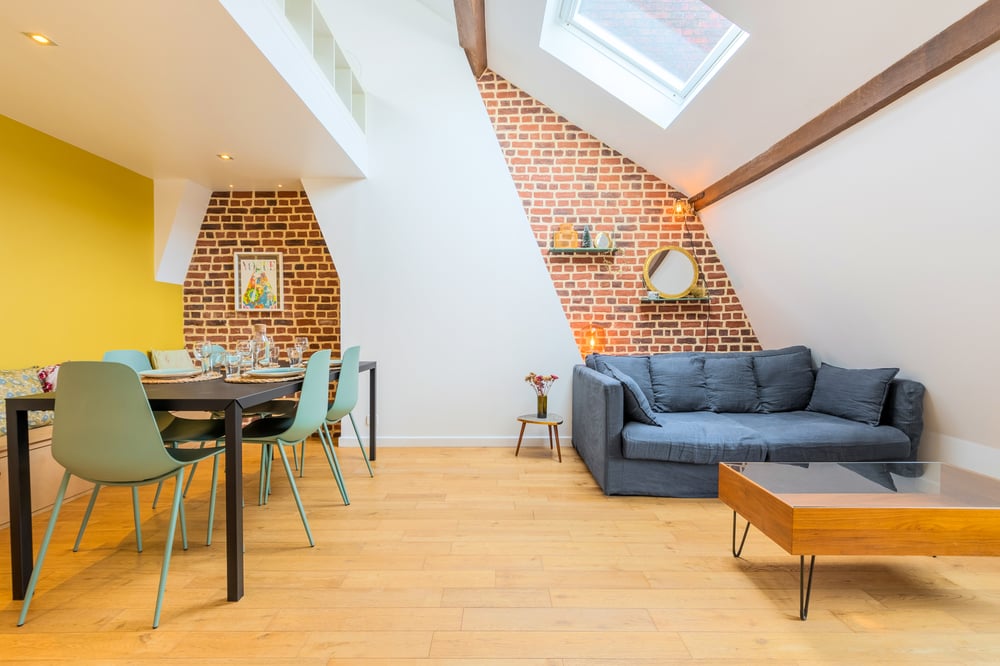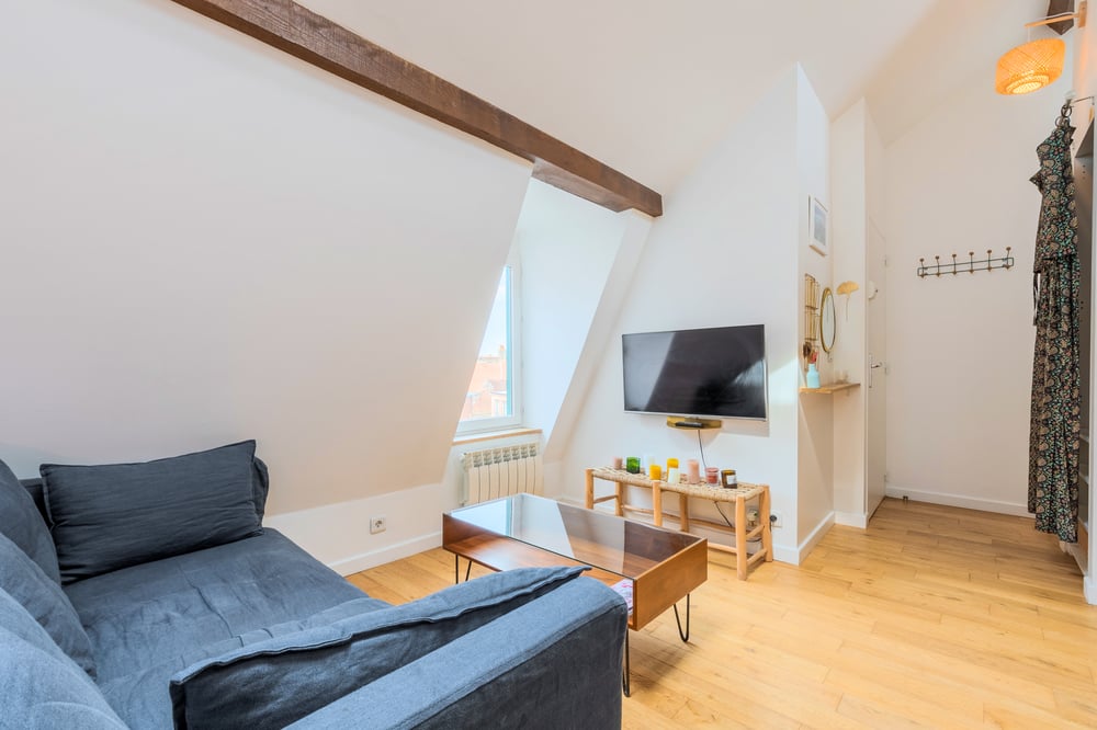 The apartment is located on rue d'Angleterre, on the third floor (no elevator) of a typical Lille building. It comprises a bright living room with balcony, a fully equipped kitchen, a spacious bedroom with double bed and a large bathroom. We love the charm of the beautifully decorated rooms and the high ceilings! The neighborhood is quite lively, so for light sleepers, we recommend you bring your own earplugs. Your accommodation will be carefully prepared for your arrival: Professional cleaning service + laundry service for household linen. All linen is provided: bed linen, bath towels, bath mats and tea towels. The kitchen is equipped with all utensils and dishes for breakfast and dinner. Entertainment available via TV: Molotov TV and Prime Video. Please note that the staircases to access the accommodation are typical of our pretty Lille buildings, especially the staircases in the communal areas. We therefore recommend that people with mobility difficulties take this into consideration before booking.