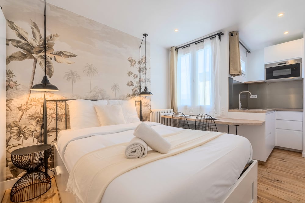 The apartment is located on Rue Baptiste Monnoyer, on the fourth floor of a typical Lille building. Please note that the staircase to access the apartment is typical of our pretty Lille buildings: the stairs are narrow, so we recommend that families with young children or people with mobility difficulties take this into consideration before booking (also think about luggage). The apartment consists of a living room with kitchen area, a double bed (140X200), modern decoration and a bathroom with shower. The apartment will be carefully prepared for your arrival: Professional cleaning service + laundry service for household linen. All linen is provided: bed linen, bath towels, bath mats and tea towels. The kitchen is equipped with all utensils and dishes for breakfast and dinner. Entertainment available via TV: Molotov TV and Prime Video. The apartment is functional, perfect for short stays.