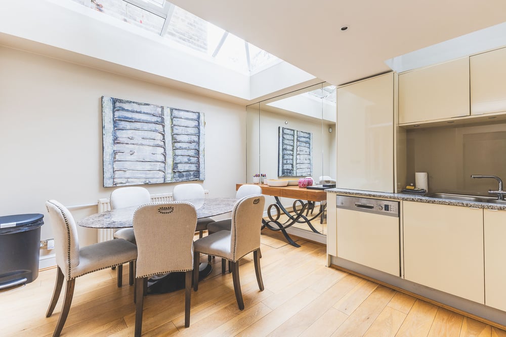 Welcome to this elegant and spacious Chelsea home — a beautifully designed retreat that perfectly combines classic London charm with modern sophistication. Thoughtfully styled and spread across four floors, this property offers a comfortable and refined base for families or groups looking to experience one of London’s most desirable neighbourhoods. The home features four beautifully appointed bedrooms, accommodating up to seven guests. There are two contemporary bathrooms fitted with a bath and wall-mounted shower, along with an additional WC for convenience. The property is located on the ground floor and extends across multiple levels, giving guests the privacy and space of a true London townhouse. Three of the bedrooms include luxurious king-sized beds, while the fourth offers a comfortable single bed — ideal for children, friends, or solo guests. The living room is warm and inviting, styled in soft neutral tones and complemented by elegant details such as bespoke shelving, statement ceramic lamps, and richly textured furnishings. The built-in shelves, softly illuminated and filled with books and artwork, frame a sleek wall-mounted TV and contemporary fireplace — the perfect setting to relax and unwind after a day of exploring the city. A large, plush corner sofa with patterned cushions adds both comfort and charm, while natural light pours through shuttered windows, creating a calm and homely atmosphere. The open-plan kitchen and dining area continue the refined aesthetic, featuring sleek cream cabinetry, granite countertops, and premium appliances for effortless cooking. A skylight fills the space with natural light, while a marble-effect dining table with upholstered chairs offers an elegant setting for leisurely breakfasts, evening meals, or a glass of wine with friends. Mirrored accents and warm wooden flooring enhance the sense of light and space, creating a welcoming environment that feels both stylish and practical. Disclaimer: !Please note there are internal stairs, which may not be ideal for guests with mobility concerns or small children! This Chelsea home combines comfort, space, and style in an unbeatable location — the perfect London getaway for families, friends, or anyone looking to experience the best of city living with a touch of luxury.