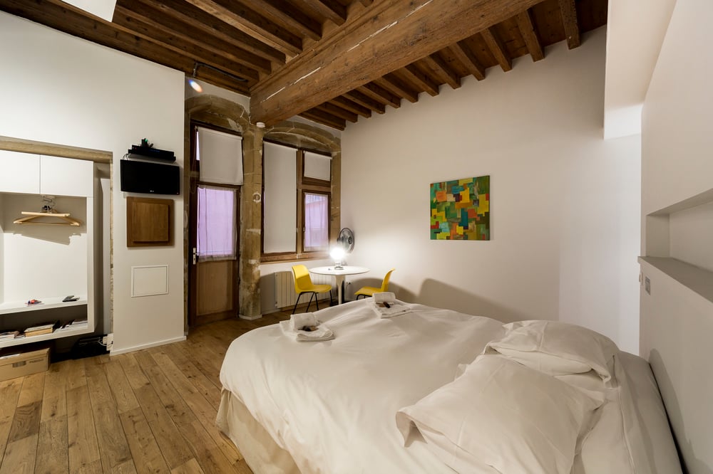 Right in the heart of old Lyon, you'll be staying in an atypical flat that's particularly quiet because it faces the courtyard. It is on the first floor without a lift. As the flat is located in an old building in Vieux Lyon, it is not particularly bright, but the joys and discoveries of the city as soon as you leave the building will satisfy you in the best possible way. The flat comprises a main room with a 160x200 double bed, TV, WIFI and storage space for your personal belongings. A fully-equipped kitchen with hob, microwave, kettle, Nespresso coffee machine, toaster, crockery, utensils and all you need for cooking. Dining area with table and 2 chairs. A bathroom with a walk-in shower, WC and washbasin completes this beautiful flat in the typical architecture of Vieux Lyon. For your comfort, the apartment is ready to welcome you. We provide hotel quality laundry (bed linen already set up, towels, bath mat, tea towel) as well as 3 welcome kits for the first night / first morning: 1 bathroom kit for 2 people (1 shampoo , 1 shower gel, 1 soap, 3 make-up remover discs, 4 cotton swabs, 1 nail file); 1 edible kit for 2 people (2 coffee capsules, 2 tea bags, 2 cocoa pods, 3 sugar pods, 2 mini-cookies); 1 maintenance kit for the living room (1 sponge, 1 washing machine tablet). Included in the cleaning fee.
