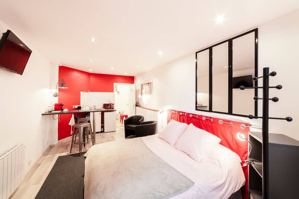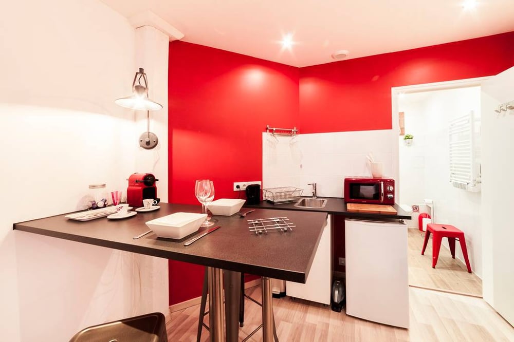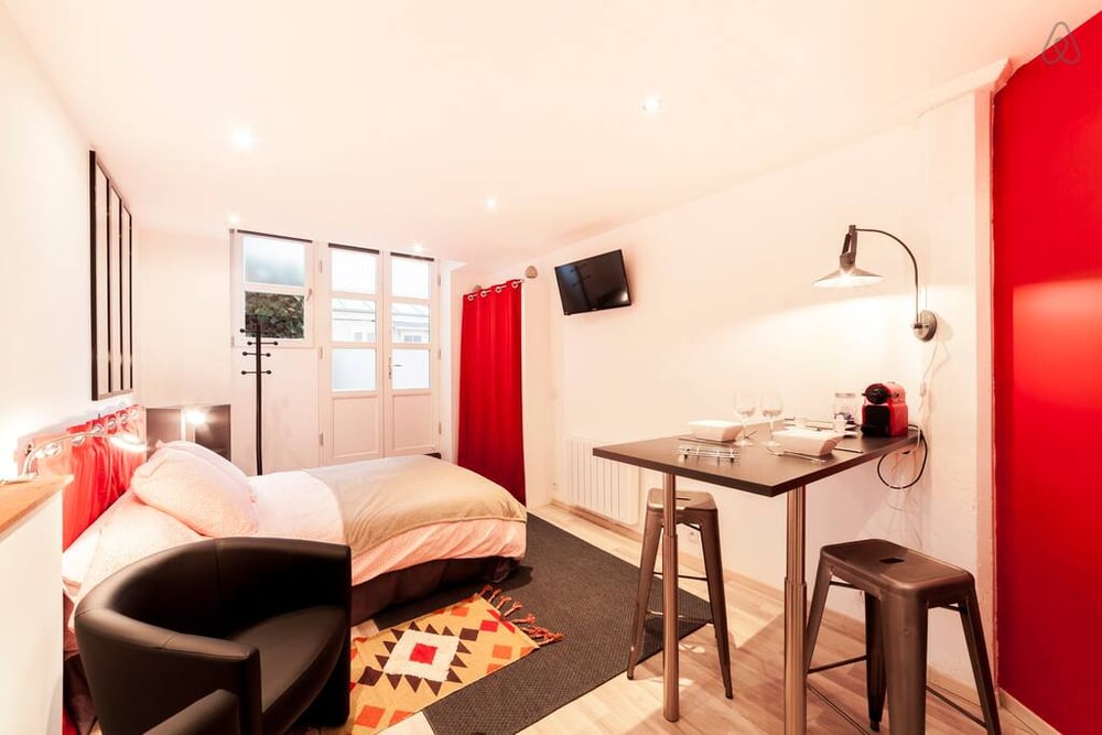 Located on the ground floor within a charming inner courtyard, this studio offers a warm atmosphere with white and red contrasts, decorative glass partition and an intimate “boutique suite” feel in the heart of Old Lyon. 🏡 Space This fully equipped apartment is designed to offer you a practical and relaxing stay in Lyon. 🛏️ Elegant sleeping area High-quality queen-size bed (160x200) Soft pillows Integrated bedside lighting Wall-mounted TV Two comfortable armchairs Cozy and intimate ambiance 🍽️ Dining area & equipped kitchenette High table with two stools Cooktop Microwave Refrigerator Nespresso coffee machine Complete cookware and tableware 🚿 Spacious modern shower room Large shower Vanity unit Heated towel rail Toilet 🏍️ Motorbike information Motorcycle garage available upon request. 🌿 Hotel comfort by ALL IN LYON included Travel light, we provide hotel-quality linen (beds made on arrival, towels, bath mats, kitchen towel) as well as welcome kits (bathroom, breakfast, cleaning), included in the cleaning fee (professional cleaning) for a seamless and worry-free stay.