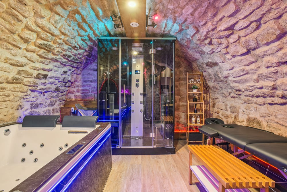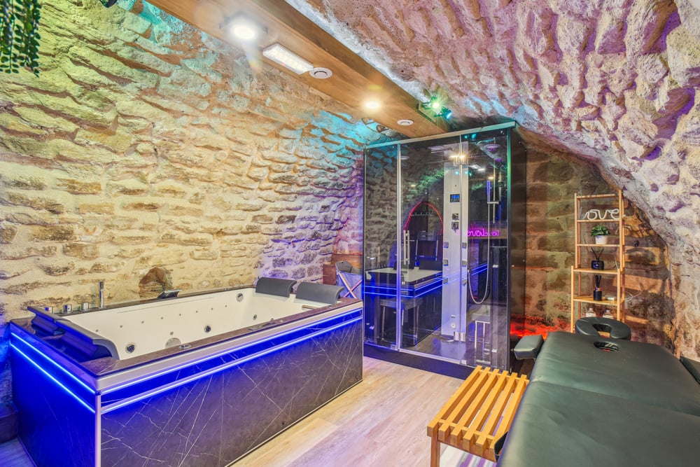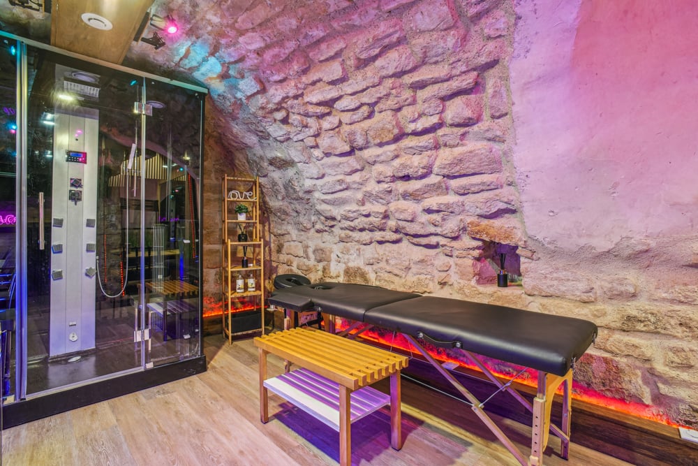 A unique love room on two levels, with a jacuzzi, hammam, sauna and massage table, for a romantic break in the heart of Paris.