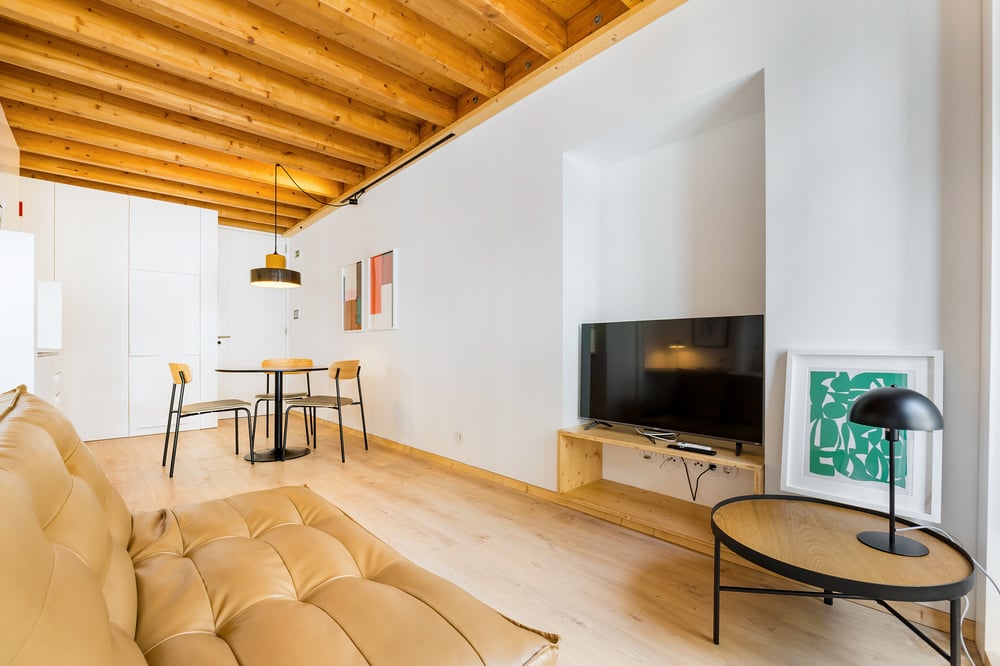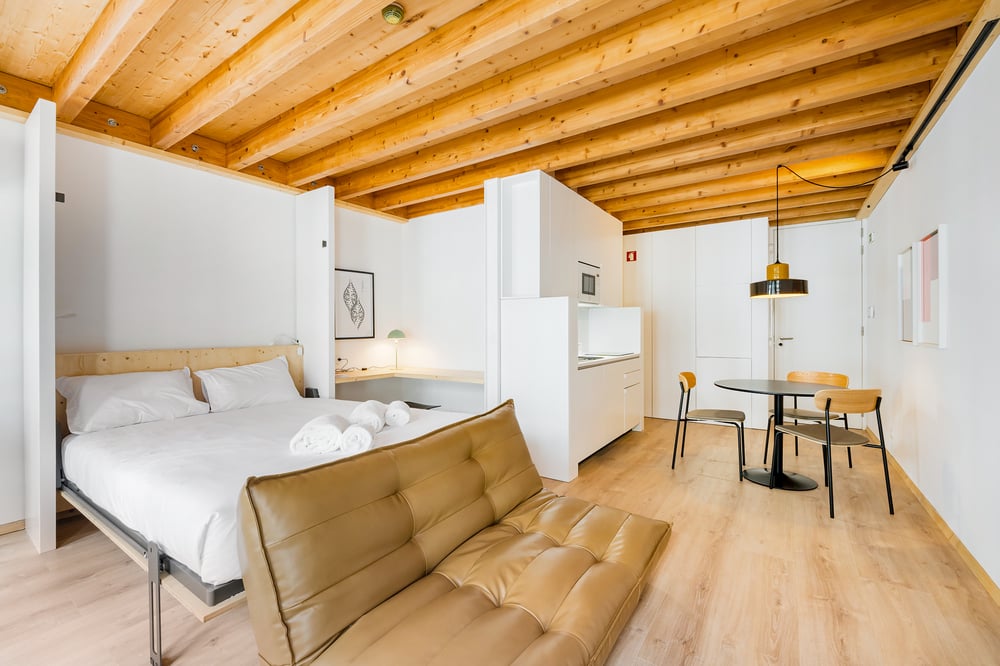 Benvenuti nel mio studio! Questo delizioso immobile di 50 m2 offre uno spazio confortevole e invitante per il vostro soggiorno in questa splendida città. Si trova al 1° piano attraverso le scale. Le travi in legno del soffitto e il pavimento chiaro aggiungono un tocco caldo e naturale allo spazio, creando un'atmosfera accogliente. La zona giorno comprende un elegante divano in pelle e una TV a schermo piatto, ideale per rilassarsi dopo una giornata trascorsa fuori. Un piccolo tavolo da pranzo è ideale per pranzi e cene informali o per lavorare. La disposizione aperta comprende anche un angolo cottura compatto ma ben attrezzato, con microonde, piastra di cottura, lavello e le pentole essenziali per i pasti. La zona notte è caratterizzata da un accogliente letto matrimoniale e da un piccolo spazio accanto ad esso, con una scrivania d'appoggio per lavorare e organizzarsi. Il bagno è dotato di tutti i servizi necessari per rinfrescarsi, compresi asciugamani puliti e articoli da toilette in omaggio. Le pulizie saranno effettuate prima del vostro arrivo previsto. Godetevi il vostro soggiorno!