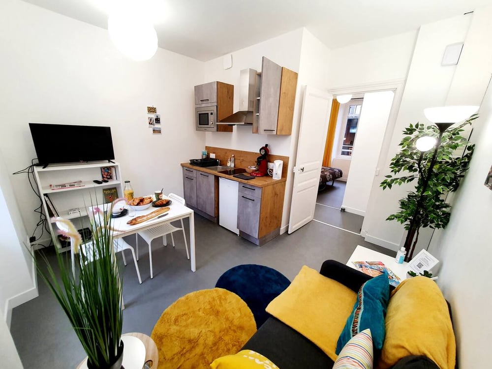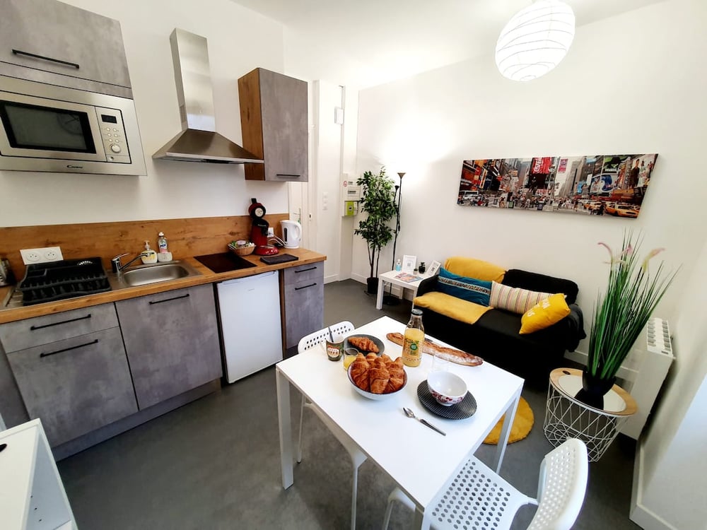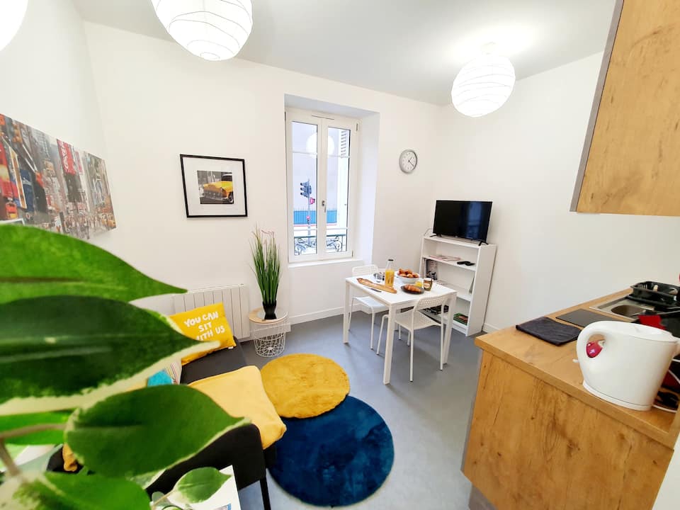 Very well located apartment, just a 5-minute walk from the train station and the city center. The accommodation has a fully equipped kitchen (microwave, stovetop, refrigerator, coffee maker, kettle, dishes, ...), a bathroom with a toilet, and a bedroom with storage space. We provide linen and some essentials for your arrival. Very pleasant to live in, spacious, bright, and modern.