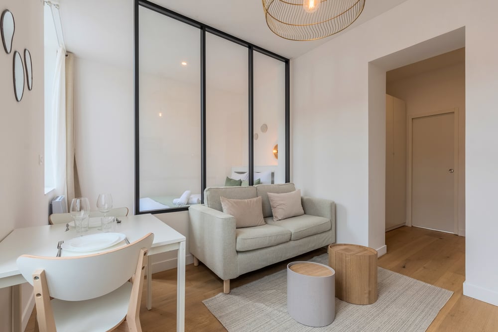 The apartment is composed as follows: - Entrance then, directly on your left on the street side, is the main room with lounge area, equipped kitchen and sleeping area with double bed - Small office space at the entrance level - Bathroom with shower cabin, sink and toilet on the garden side The accommodation will be carefully prepared for your arrival: Professional cleaning service + laundry for linens. All linen is provided: bed linen, bath towels, bath mats and tea towels. The kitchen is equipped with all the utensils and dishes for lunch and dinner. Here is the entertainment available to you via TV: Molotov TV and Prime Video.