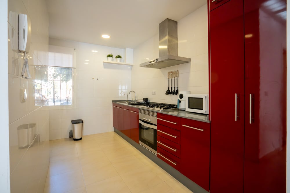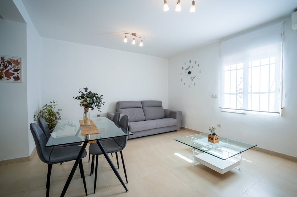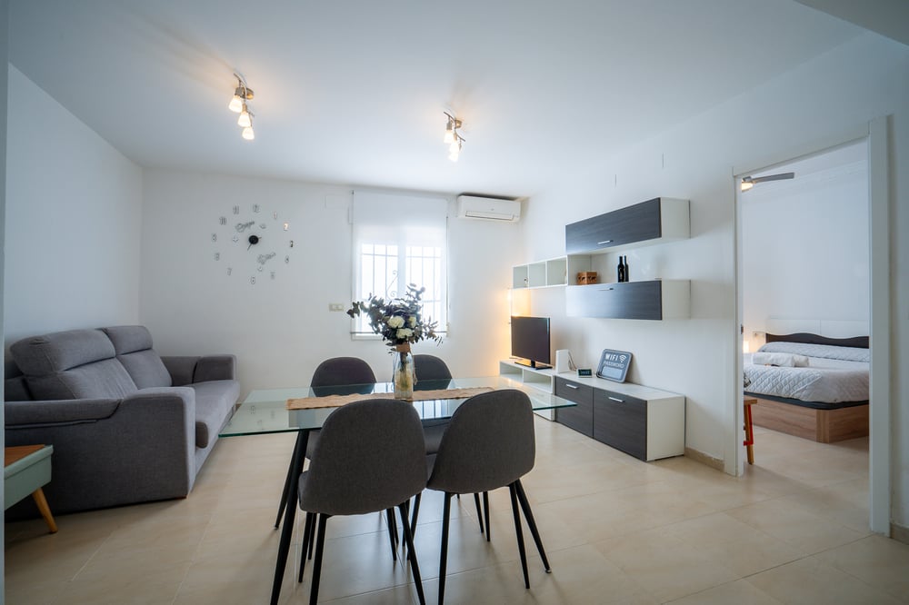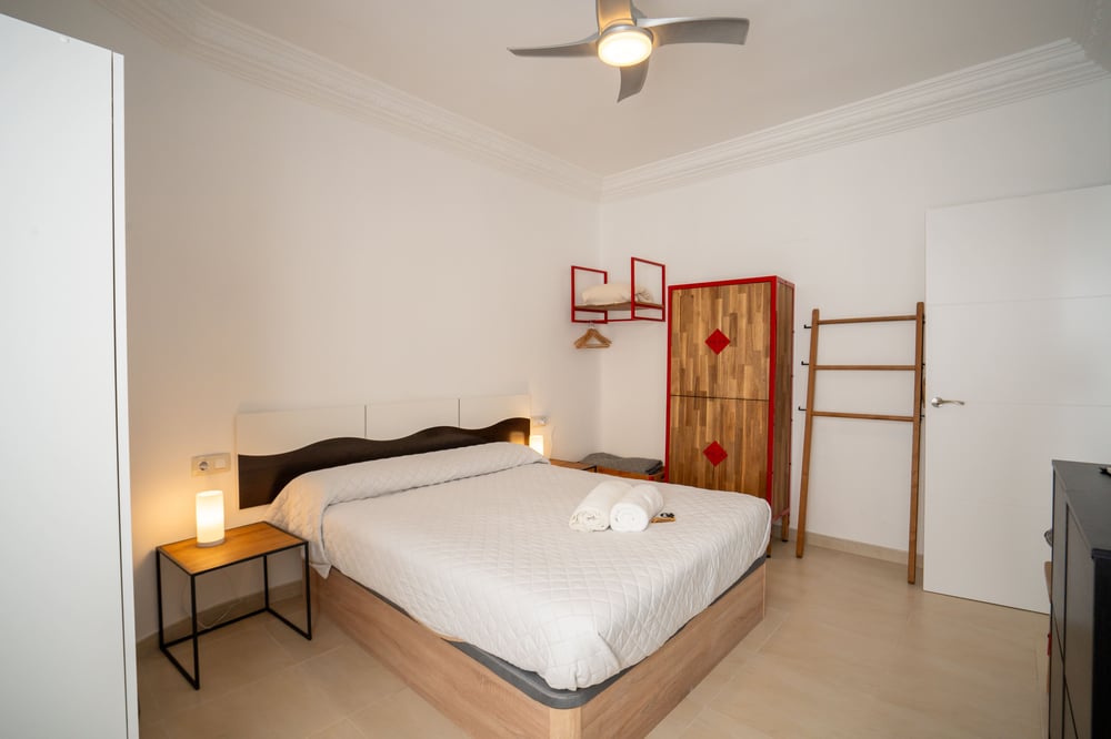 Welcome to my apartment! This charming 59 m² one-bedroom apartment in Valencia offers the perfect retreat for families or friends seeking relaxation and comfort. Nestled on the mezzanine floor and accessible by stairs, the property combines tastefully furnished decor with all the modern amenities you need for an enjoyable stay. The open-plan living area is thoughtfully furnished with a comfortable double sofa bed and a TV, perfect for unwinding after a day of exploring. The kitchen is fully equipped for all your culinary needs, featuring essential appliances such as a stove, oven, and microwave. A washing machine, drying rack, and ironing equipment provide everything you need for hassle-free laundry. The bedroom is designed for your comfort, offering a double bed fitted with plush, hotel-quality linens and ample storage space to make you feel at home. The bathroom is well-appointed with all the necessary amenities, including fresh towels and complimentary toiletries, ensuring a pleasant experience. The apartment is professionally cleaned before each stay, ensuring a welcoming and hygienic environment for your peace of mind. Enjoy your stay!