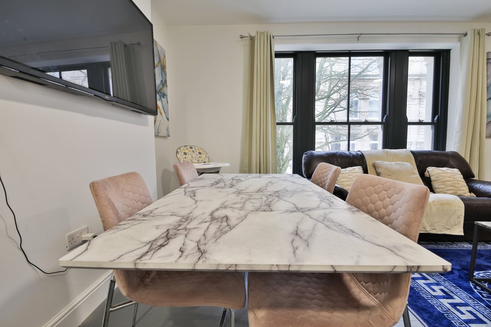 Our spacious and well-designed three-bedroom flat offers a comfortable and practical layout, ideal for families, friends, or colleagues travelling together. Each bedroom is furnished with two single beds, providing flexible sleeping arrangements and a restful space to unwind. The flat benefits from two modern bathrooms, ensuring convenience and privacy for larger groups. The living area is bright and welcoming, designed for relaxing after a day out, while the layout flows smoothly from room to room for easy, everyday living. Thoughtfully organised and full of natural light, this flat offers a calm, comfortable home-from-home perfect for both short stays and longer visits.