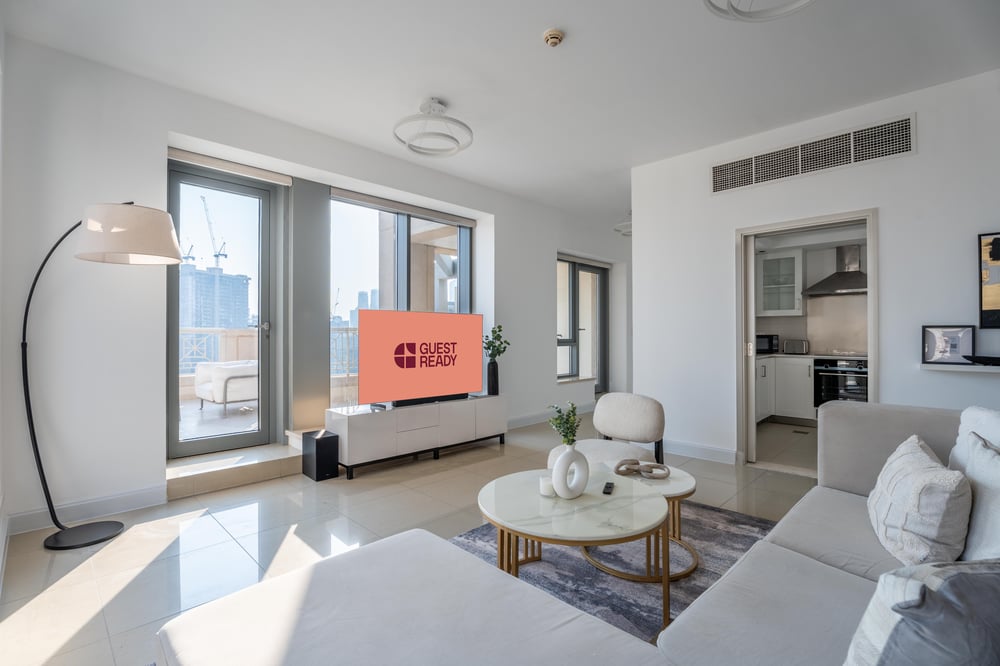 Welcome! This elegant and spacious one-bedroom apartment offers the perfect blend of modern comfort and sleek design, featuring bright open-plan living areas and three spacious balconies to enjoy the stunning city views. The living room showcases chic décor, a comfortable sofa bed, a large smart TV, and floor-to-ceiling windows that fill the space with natural light. Sliding doors open to the balconies, offering lovely spots to relax and unwind outdoors. The modern closed kitchen is fully equipped with high-end appliances and everything you need to prepare meals at home. The adjoining dining area, set with a cozy table for two, is ideal for intimate dinners or peaceful mornings with a view. The bedroom features a luxurious king-size bed dressed in hotel-quality linens, providing a restful retreat after a day exploring the city. The bathroom is thoughtfully designed with a sleek, modern finish and is stocked with fresh towels and complimentary toiletries for your comfort and convenience. The apartment is always professionally cleaned for your comfort. Daily housekeeping services are available upon request for an additional fee. Please note, Dubai is a vibrant and ever-growing city, and with these developments come occasional construction in the apartment building or surrounding area. While this may bring some urban sounds or affect the views from the property, it is all part of the city’s dynamic growth. We truly appreciate your understanding and look forward to hosting you. Enjoy your stay!
