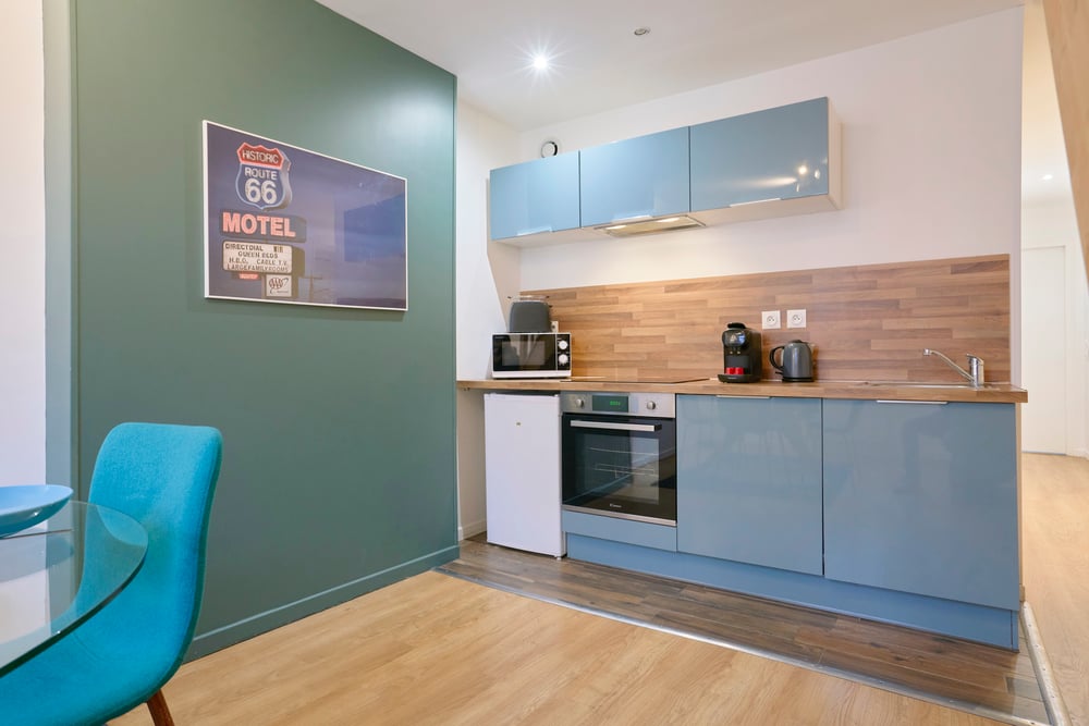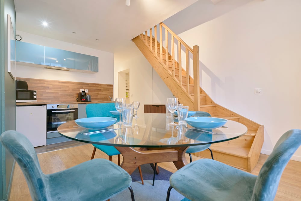 The apartment comprises a living room with dining area and open kitchen, two bedrooms (one on the first floor) with double beds (one 140/200 cm and one 160/200 cm) and individual TVs, and a bathroom with shower. The apartment is located on the fourth floor of a secure residence without elevator. The staircase to the apartment is typical of our pretty Lille buildings: the stairs are narrow, so we recommend that families with young children or people with mobility difficulties take this into consideration before booking. It will be carefully prepared to welcome you: Professional maid service + laundry for household linen. All linen is provided: bed linen, bath towels, bath mats and tea towels. The kitchen is equipped with all utensils and dishes for lunch and dinner. Entertainment available via TV: Molotov TV, Prime Video! You'll love this apartment for its fully-equipped rooms and proximity to the city center!